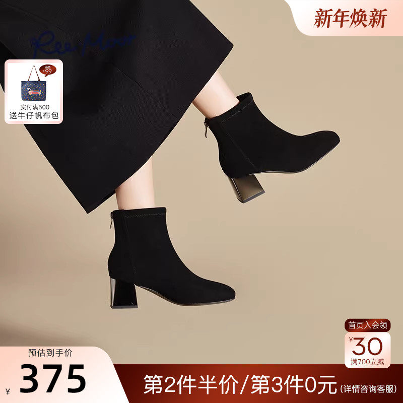 REEMOOR睿慕25新款粗跟时装靴女复古绒面方头中跟短靴