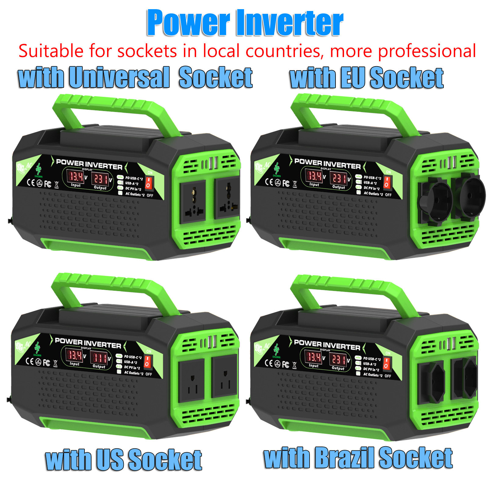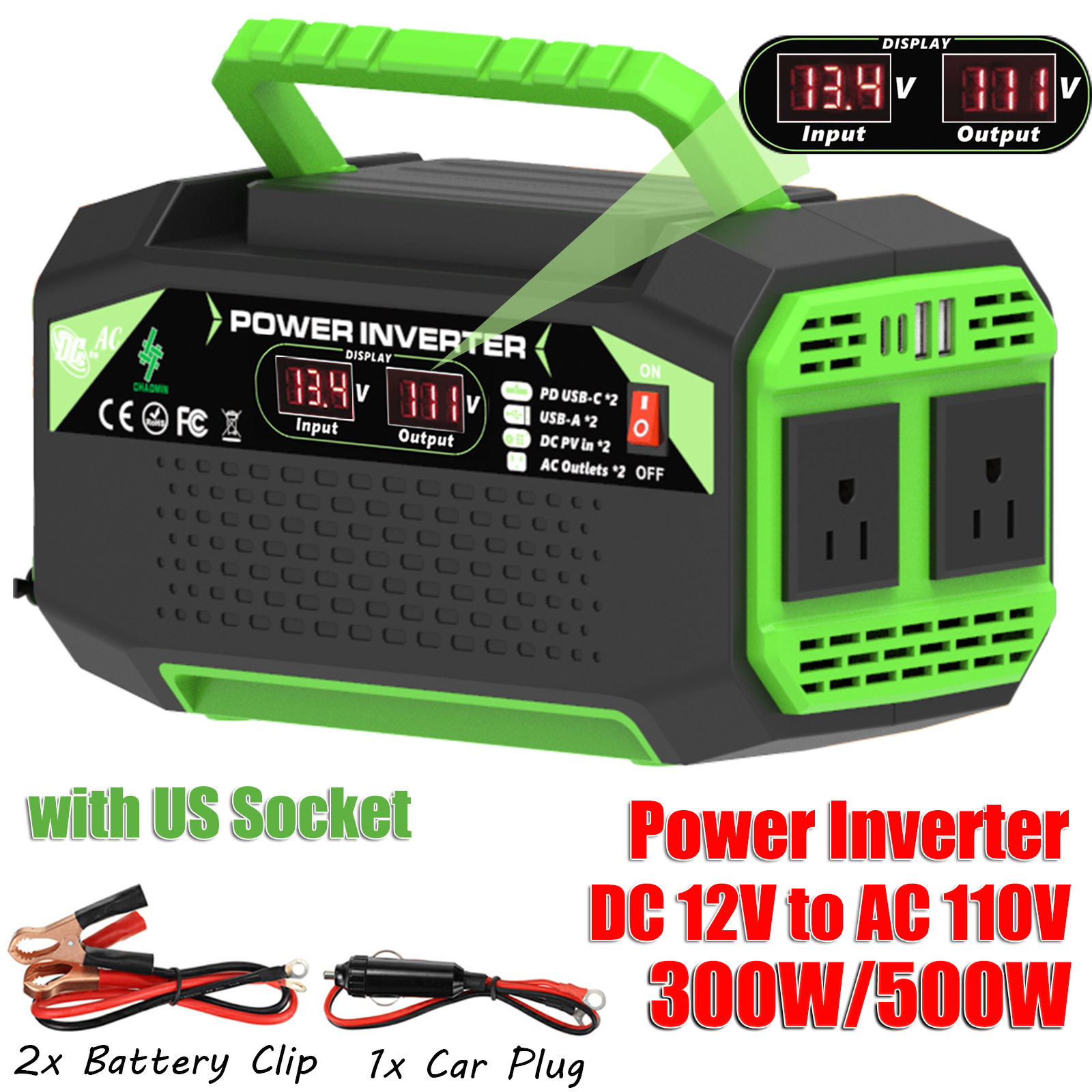 逆变器300W500W12V转220V/110V欧美规巴西规双插座4USB快充显示屏