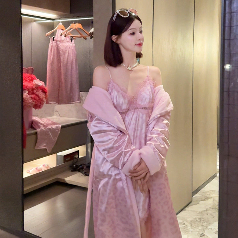 睡衣女士2025年新款夏季薄款冰丝吊带睡裙火辣性感蕾丝睡袍三件套