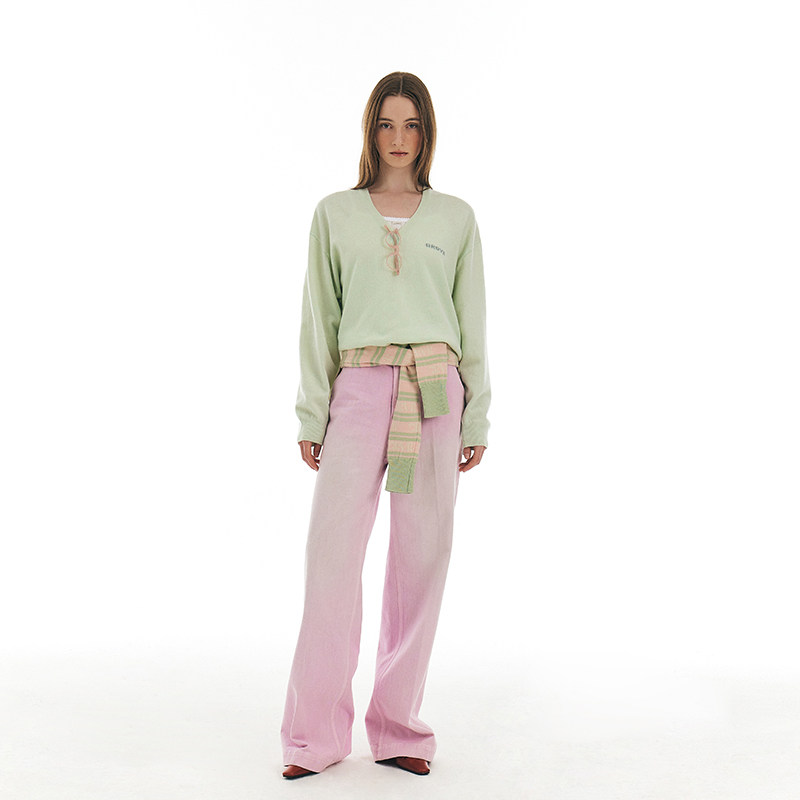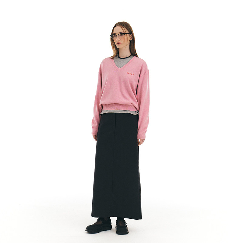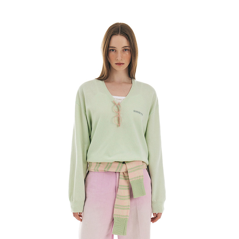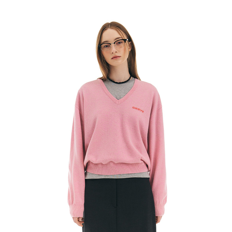 GROVE官方旗舰店女春季款休闲纯色V领字母刺绣羊毛长袖针织毛衣