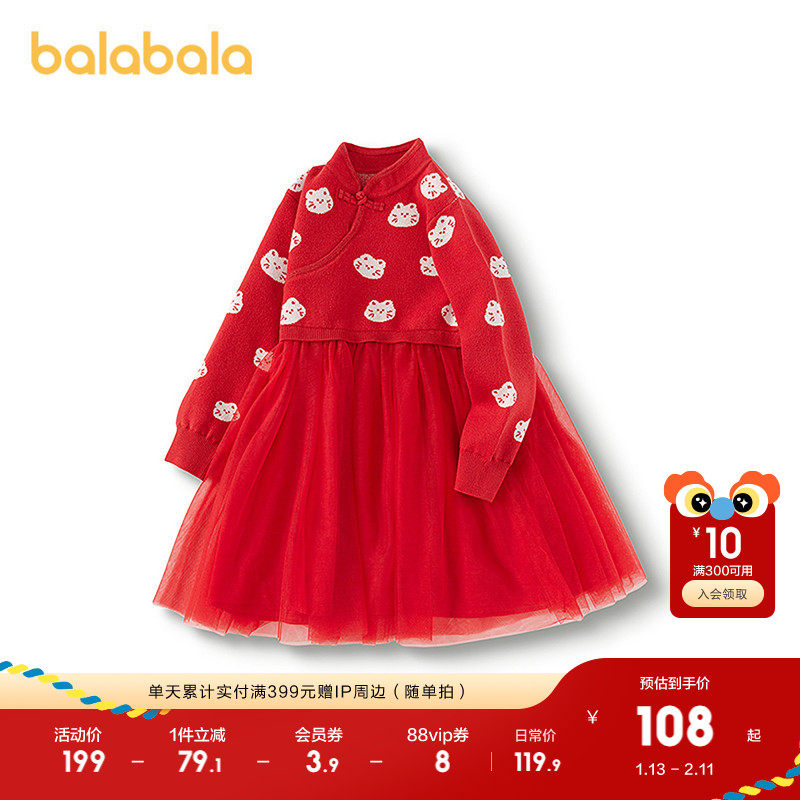 巴拉巴拉女童连衣裙宝宝拜年裙子冬装新款童装儿童红色洋气公主裙