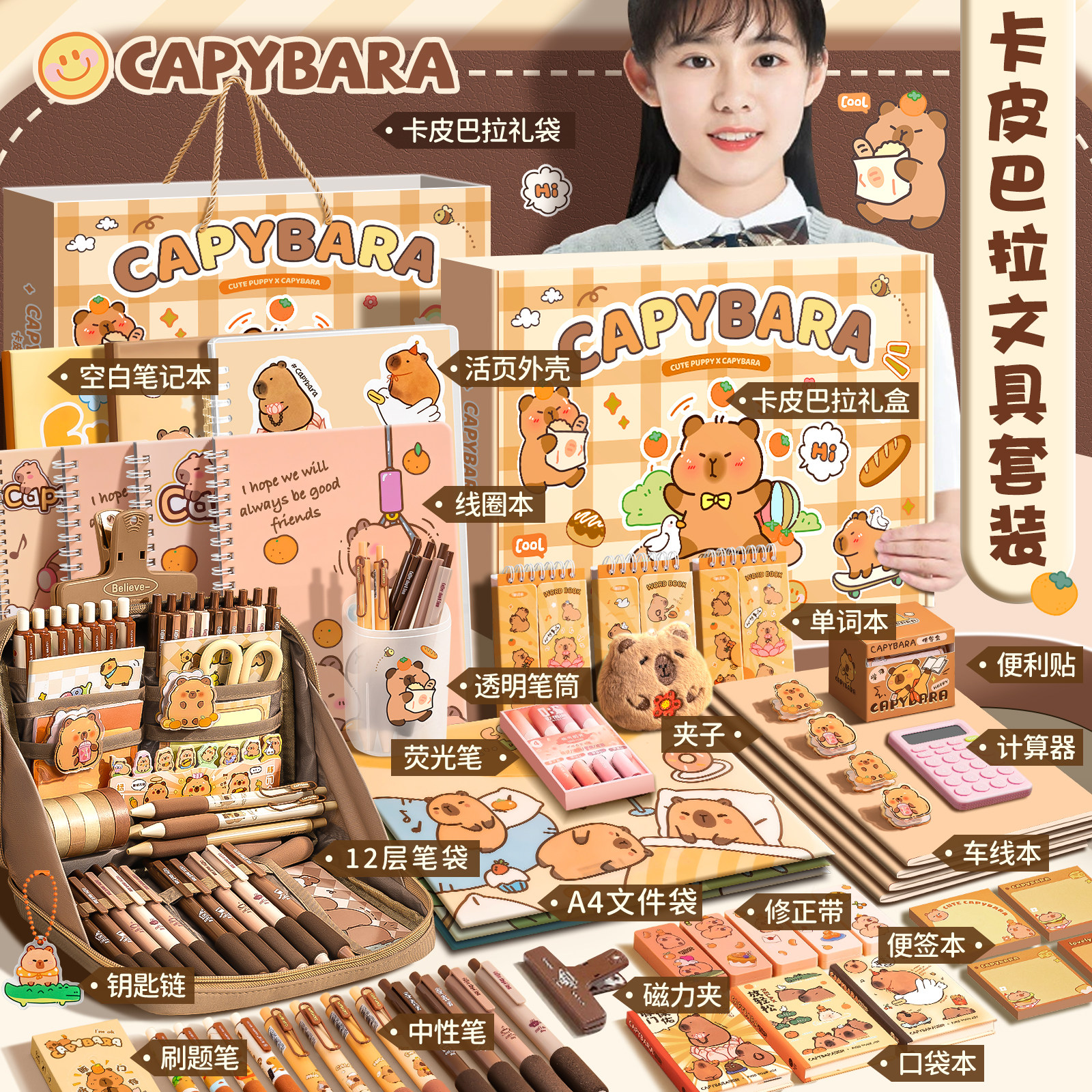 卡皮巴拉文具套装礼盒6女童高颜值生日礼物10岁女孩学习用品大礼包8网红男孩儿童小学生初中奖励一年级伴手礼