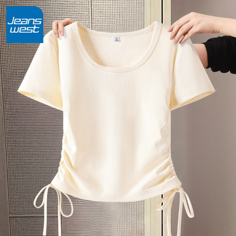 真维斯女U领抽绳修身短T恤2025夏季新款
