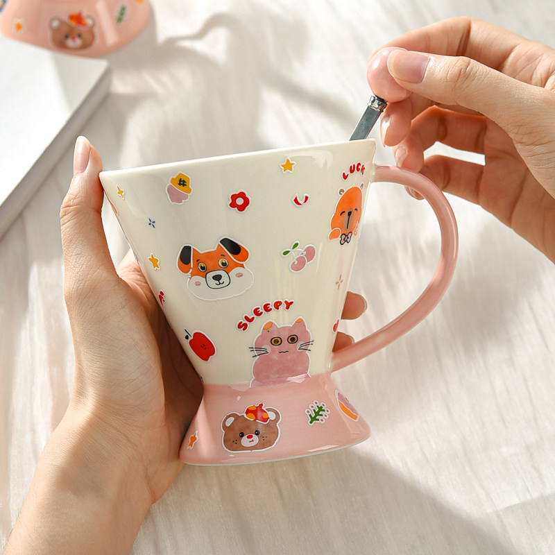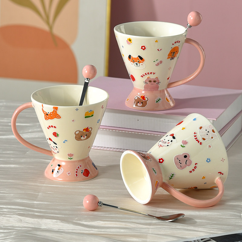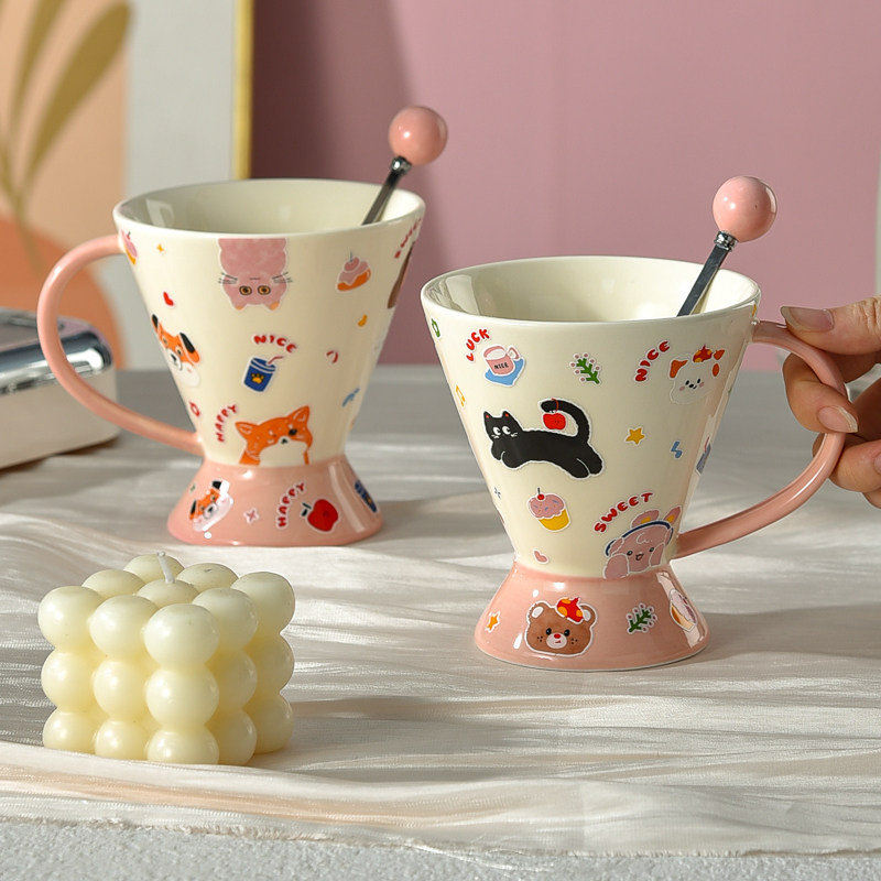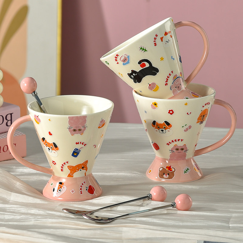 可爱小猫喇叭杯陶瓷咖啡杯带勺冰激凌雪糕杯女生高颜值早餐牛奶杯