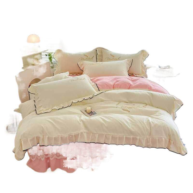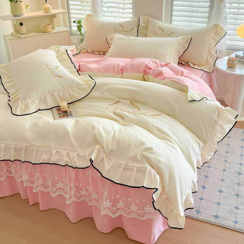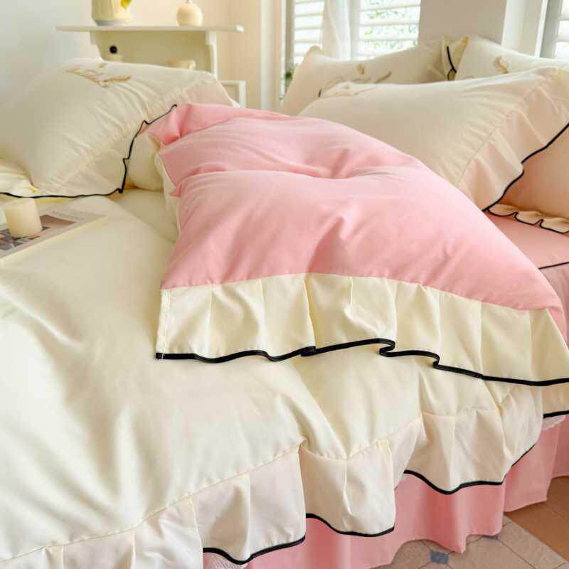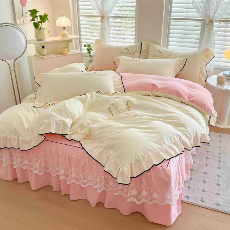 小清新简约超柔2025新款水洗磨毛系列四件套床裙款双拼色床上用品