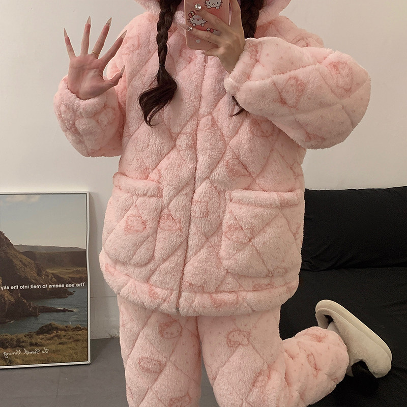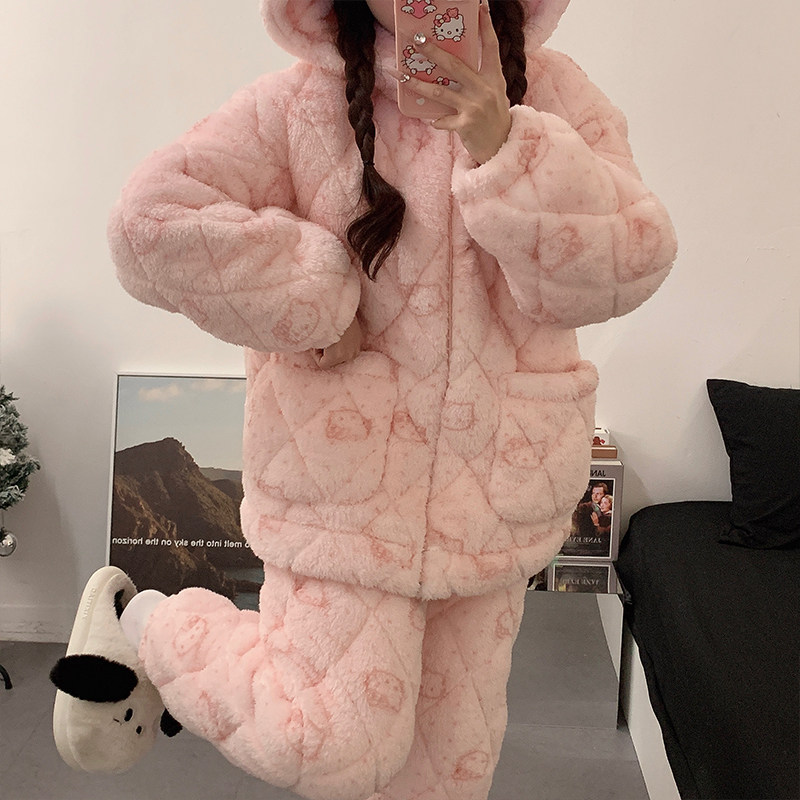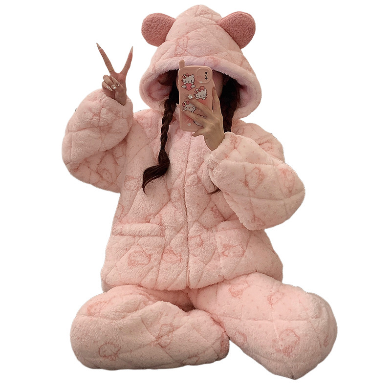 三层夹棉睡衣女款冬季加厚加绒保暖2025新款珊瑚绒女士连帽家居服
