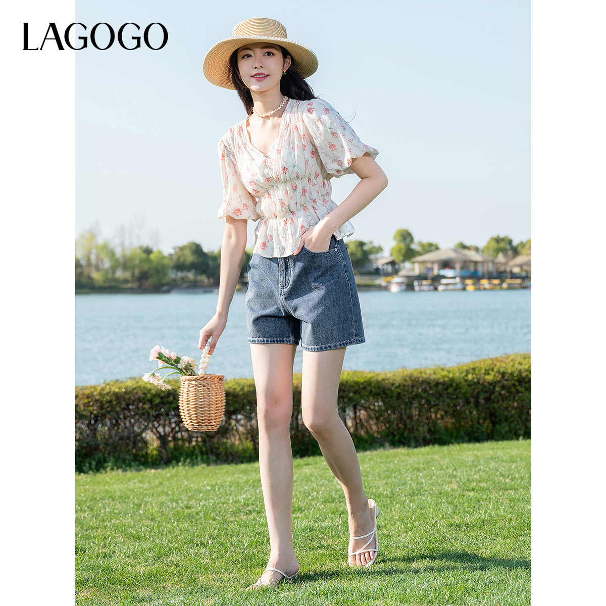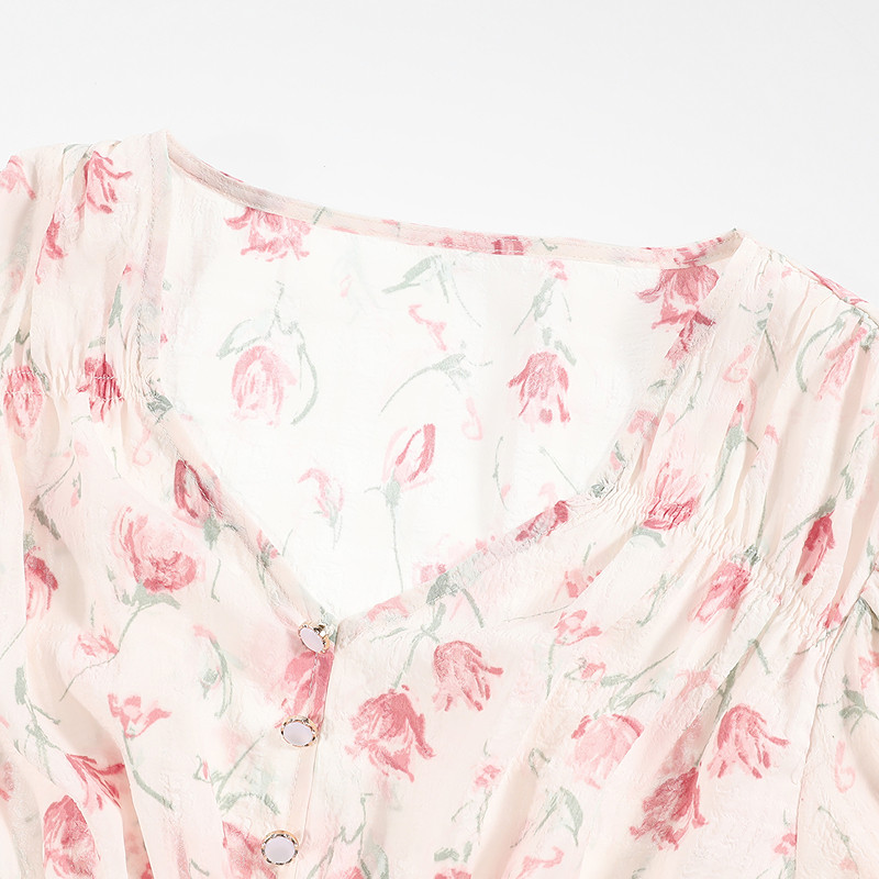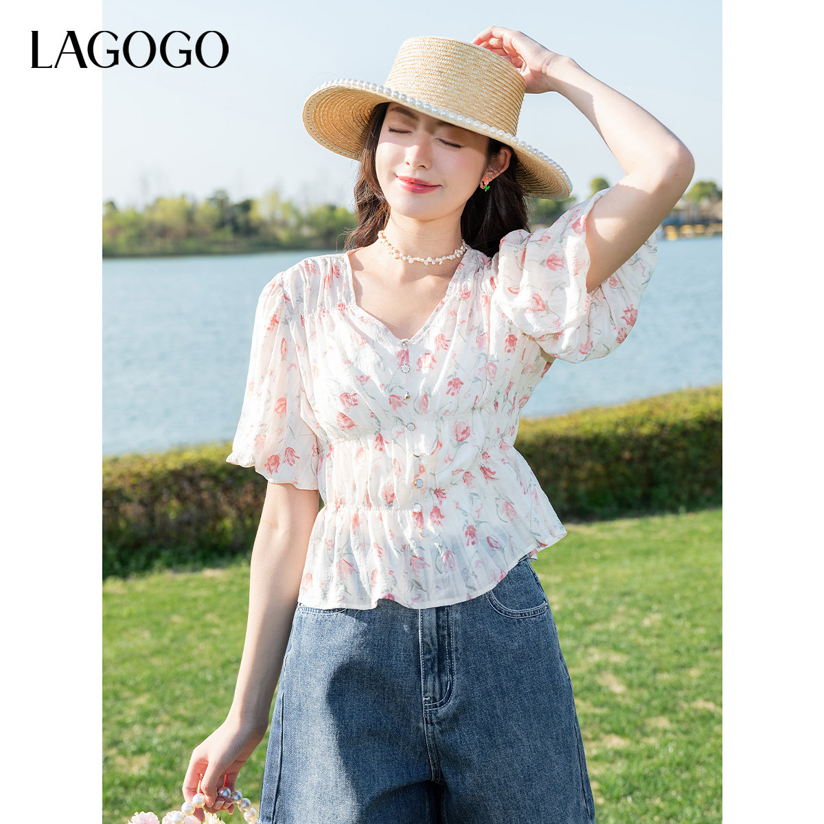LAGOGO钻石领碎花雪纺衫女拉谷谷夏新款淑女泡泡袖修身上衣
