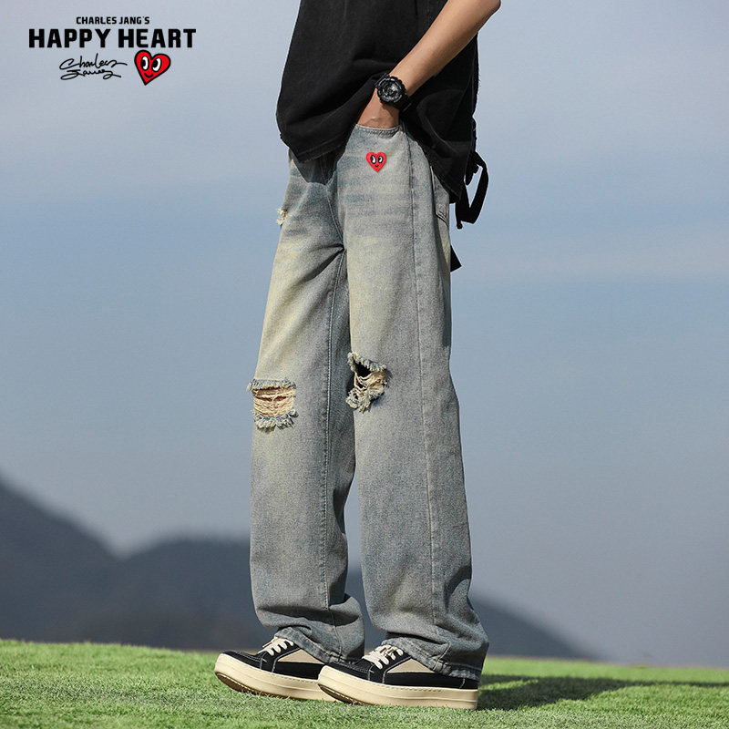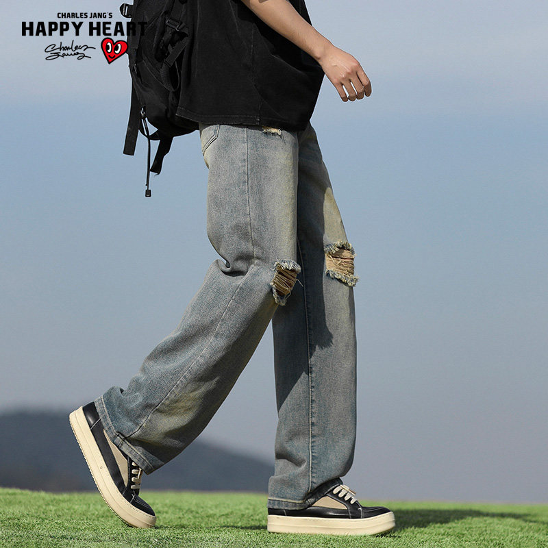 查尔斯桃心 美式复古牛仔裤男夏季新款破洞宽松阔腿直筒垂感长裤