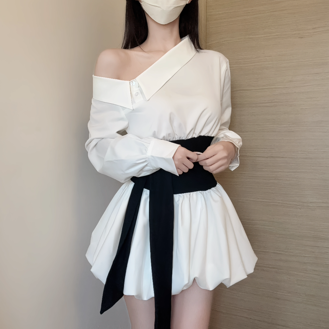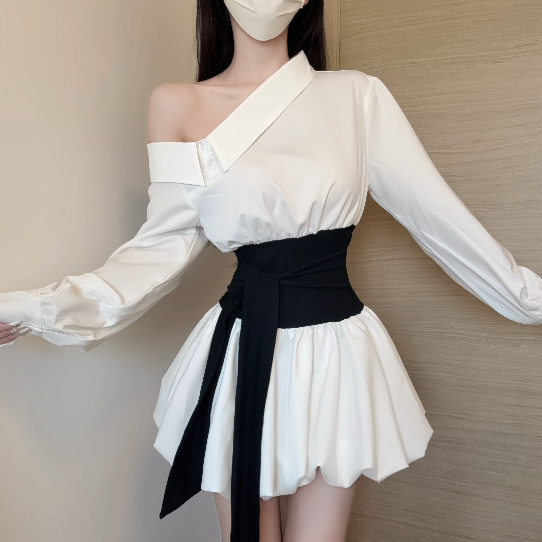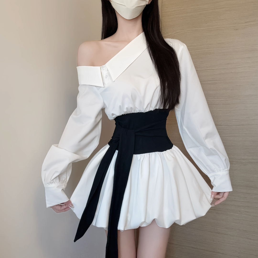 iqcq气球熊韩系辣妹斜肩长袖上衣女拼接绑带收腰设计感蓬蓬连衣裙