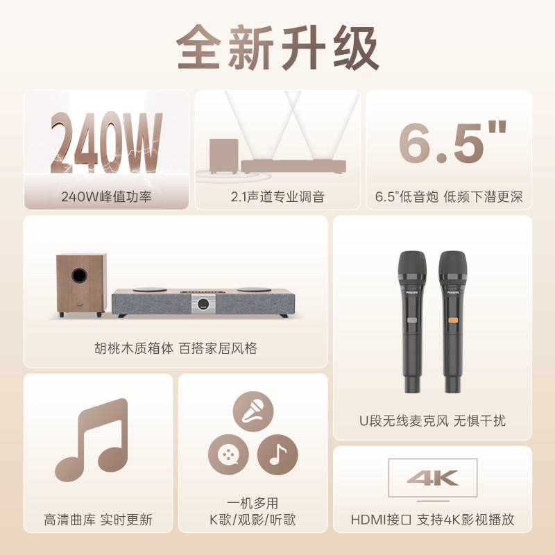 飞利浦TAB5880智能K歌回音壁胡桃木色家庭影院低音炮套装电视音响