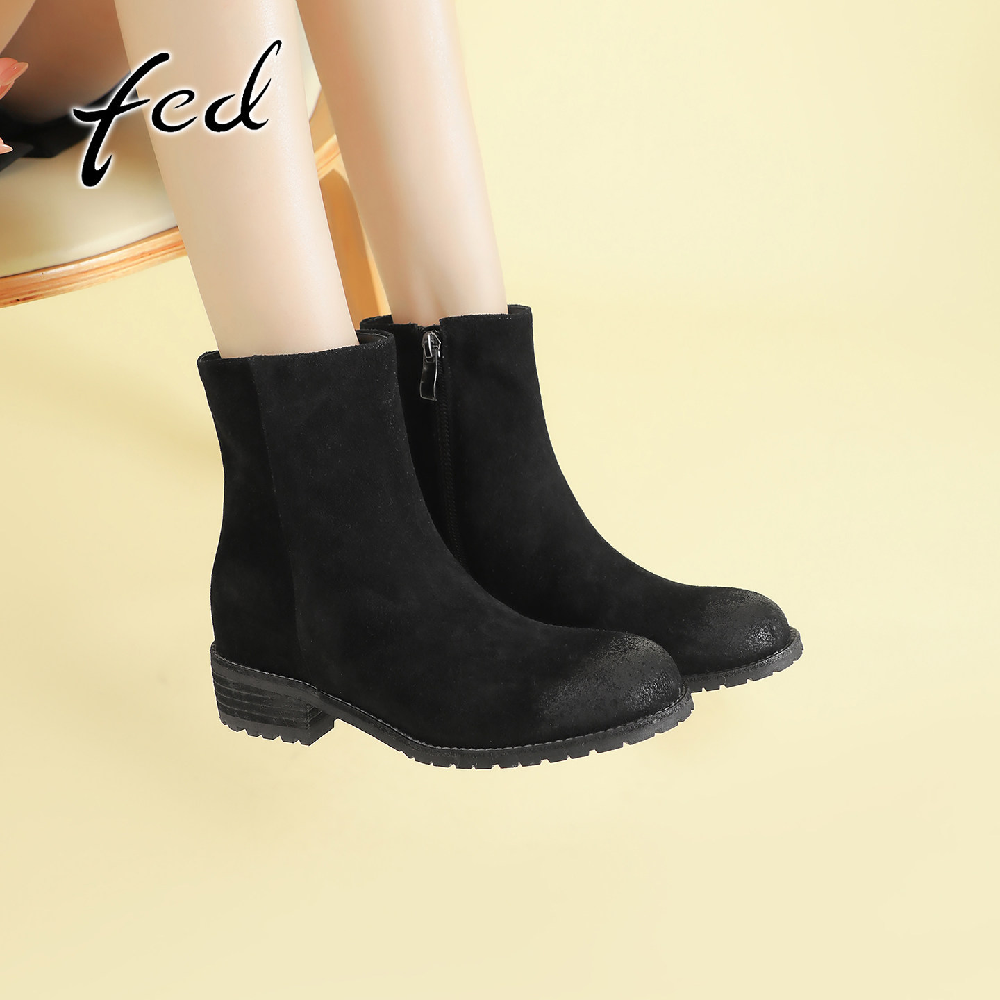 fed复古擦色牛反绒粗跟切尔西靴女秋冬新款侧拉链内增高圆头短靴