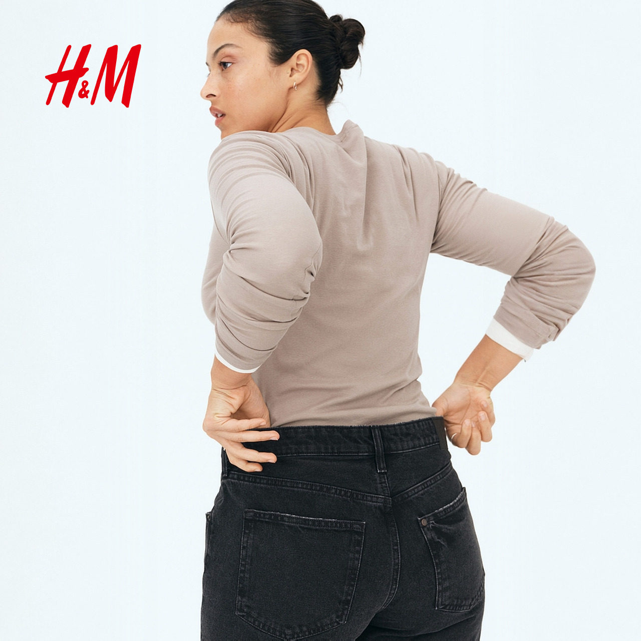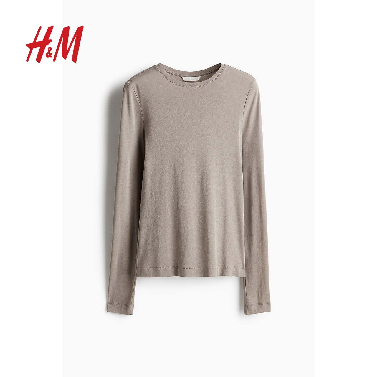 HM女装T恤春季时尚简约气质修身棉质长袖圆领上衣1266888