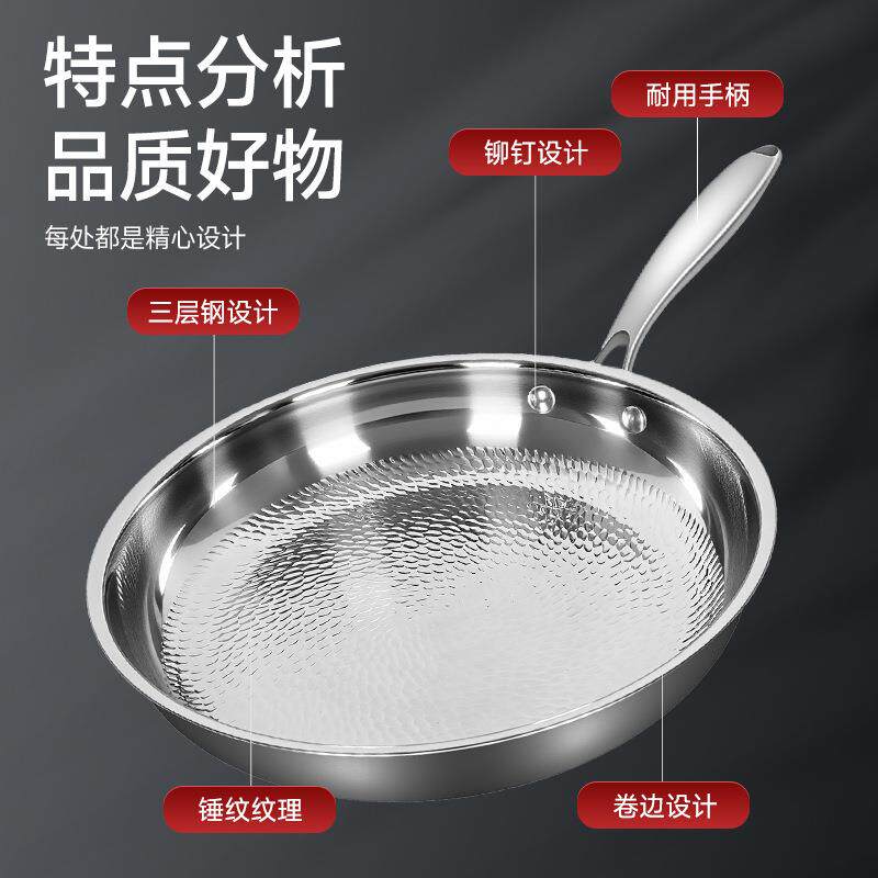 苏泊尔无涂层浅平底锅牛排家用煎锅锤纹蜂巢纹三层304不锈钢不粘