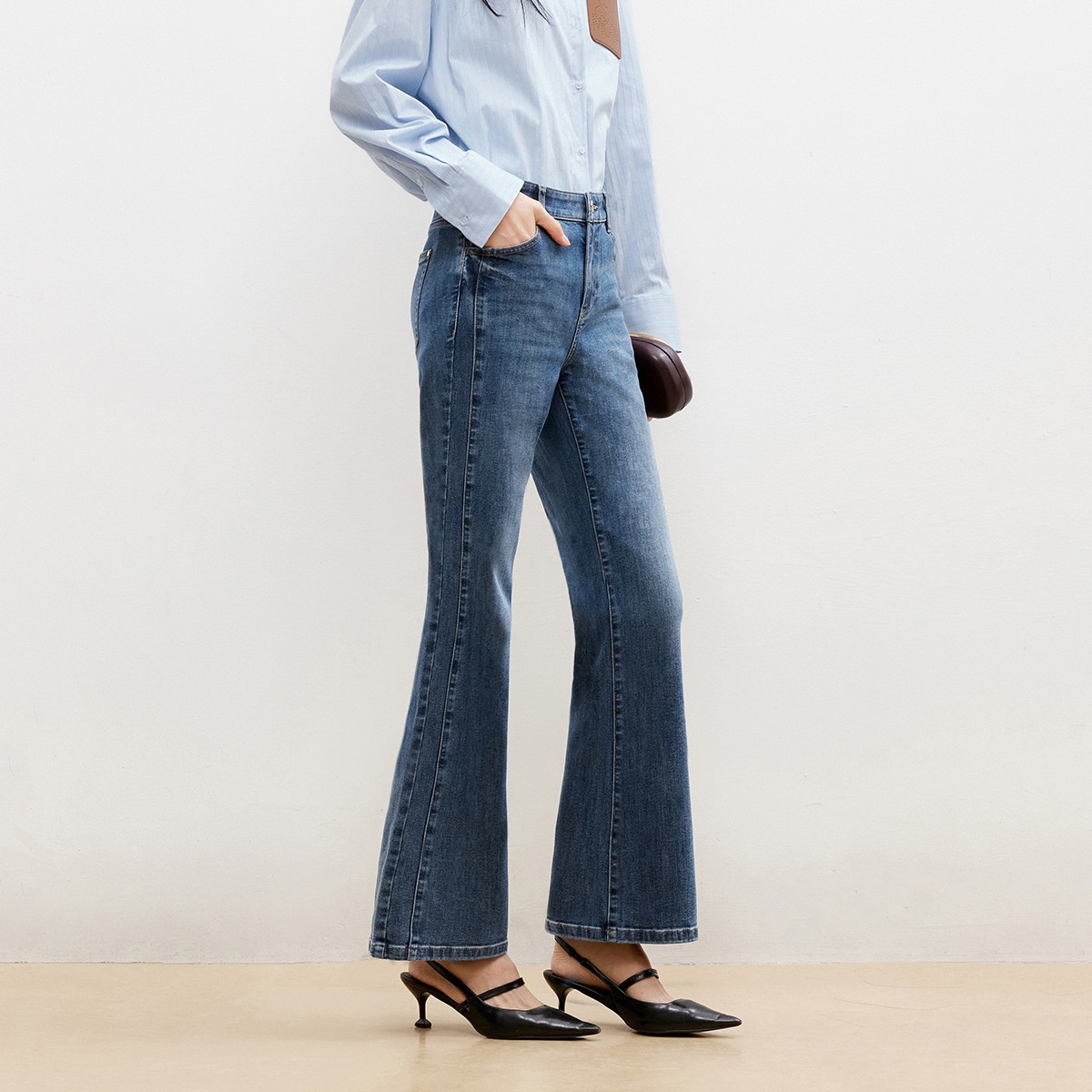 王家有鱼秋季新款2025复古蓝微喇牛仔裤中高腰不贴腿显瘦裤子女款