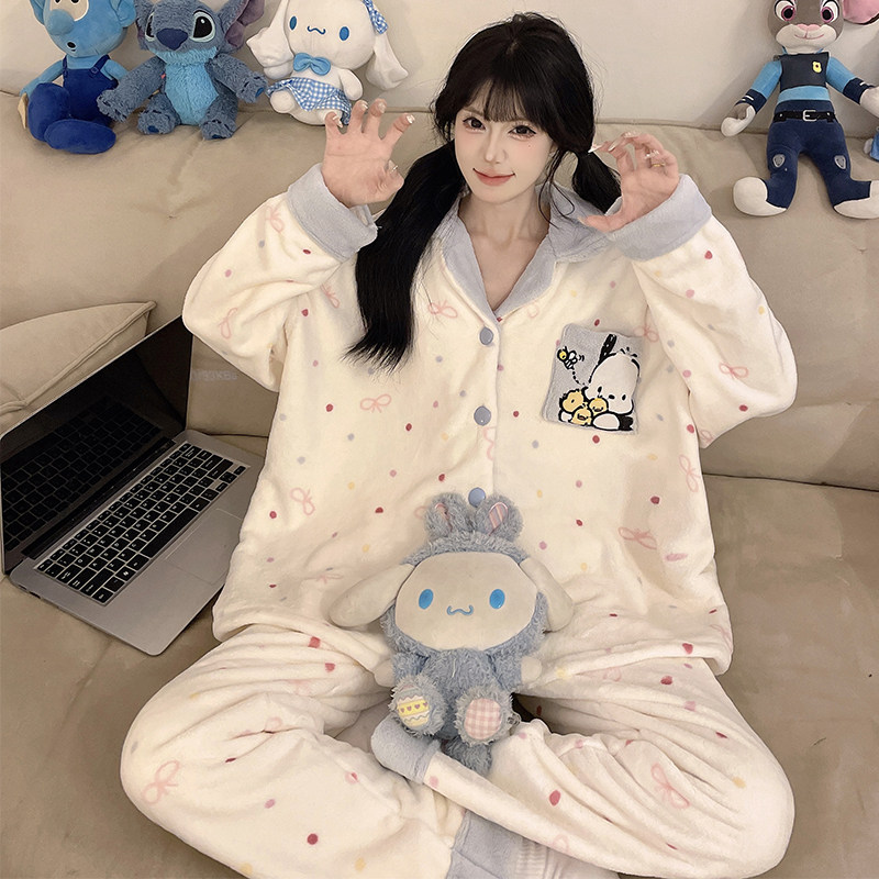 2025年新款卡通可爱法兰绒睡衣女秋冬加绒加厚套装卡通保暖家居服