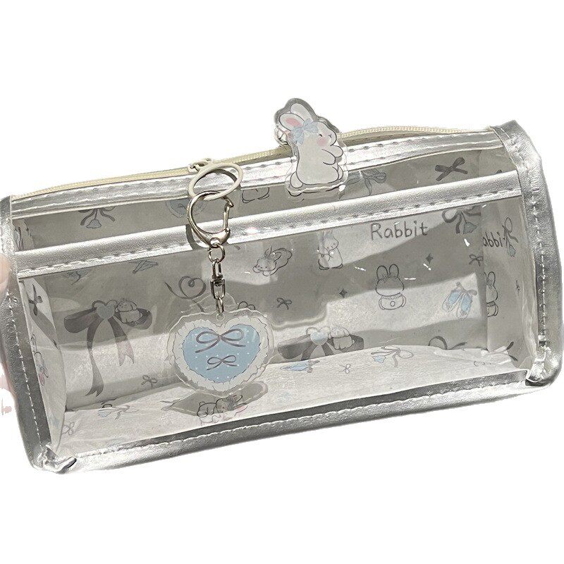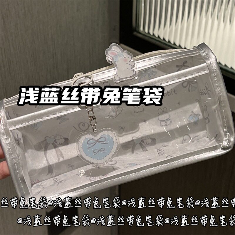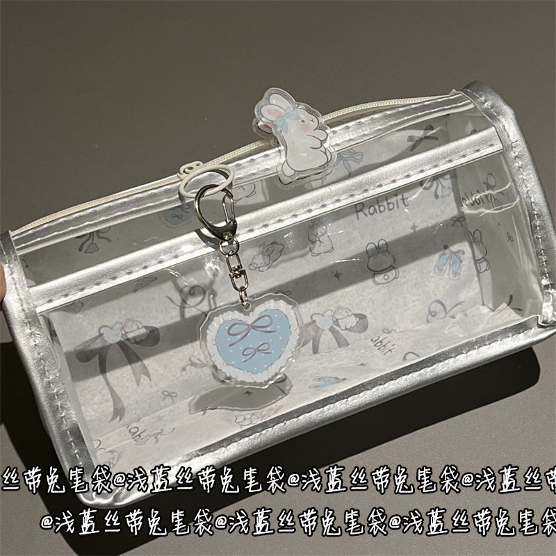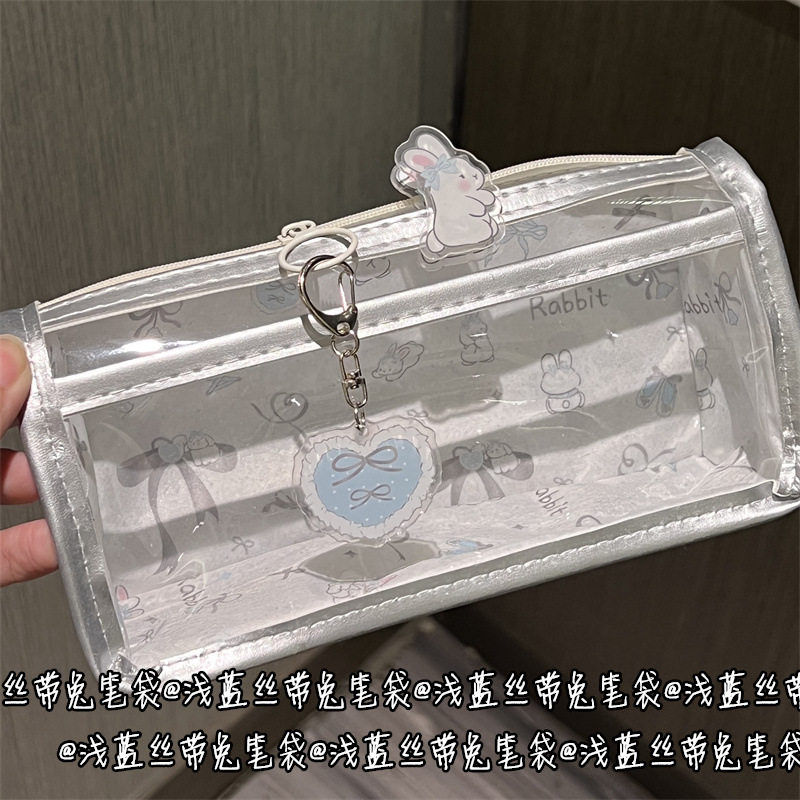 浅蓝丝带兔兔双层透明笔袋风高颜值心式学生文具笔袋