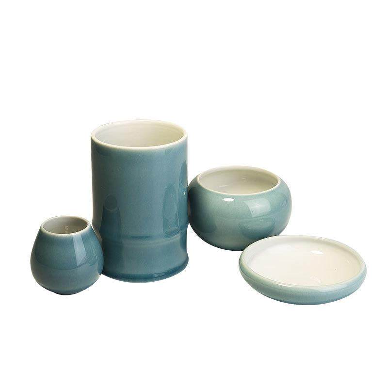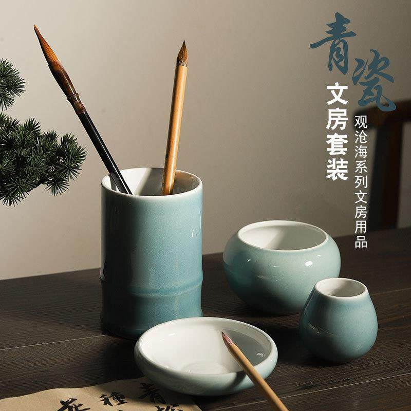 汝窑青瓷陶瓷大笔筒笔洗水碟洗毛笔四件套国画缸墨盘墨碟学生