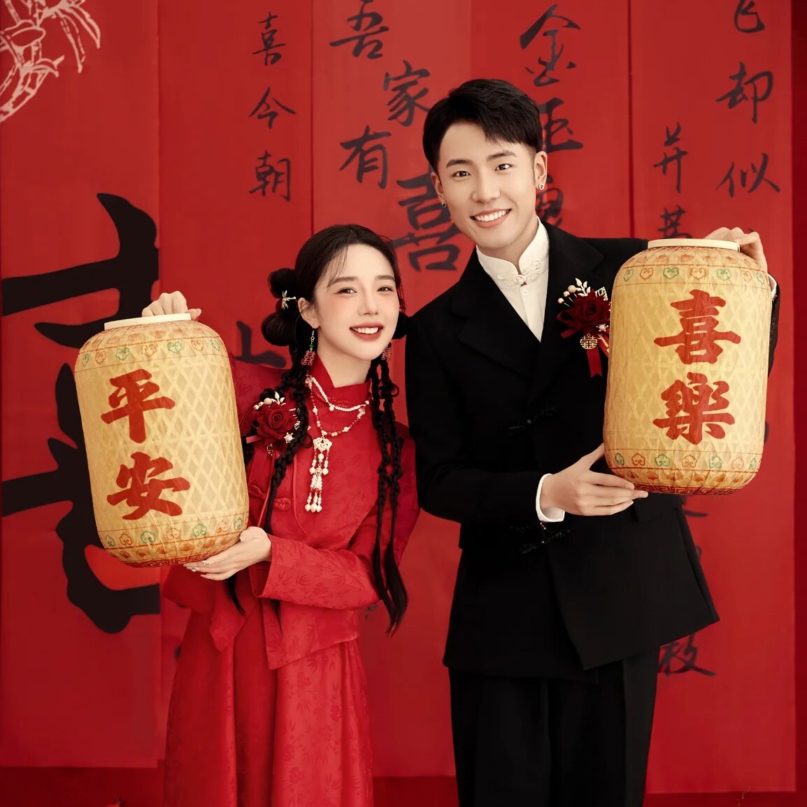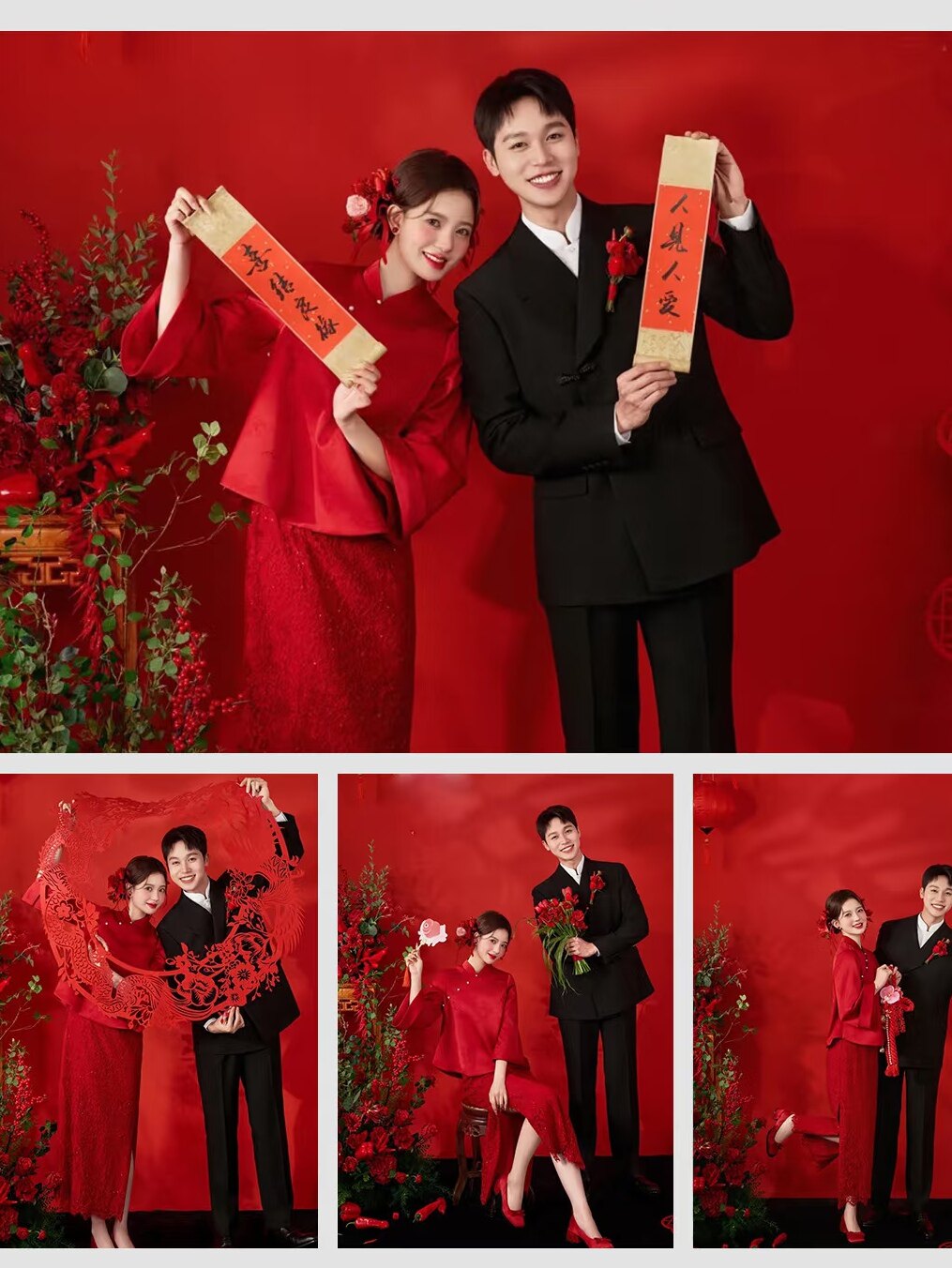 新中式婚纱照道具龙凤呈祥背景插花新娘手环花手持小对联手捧花