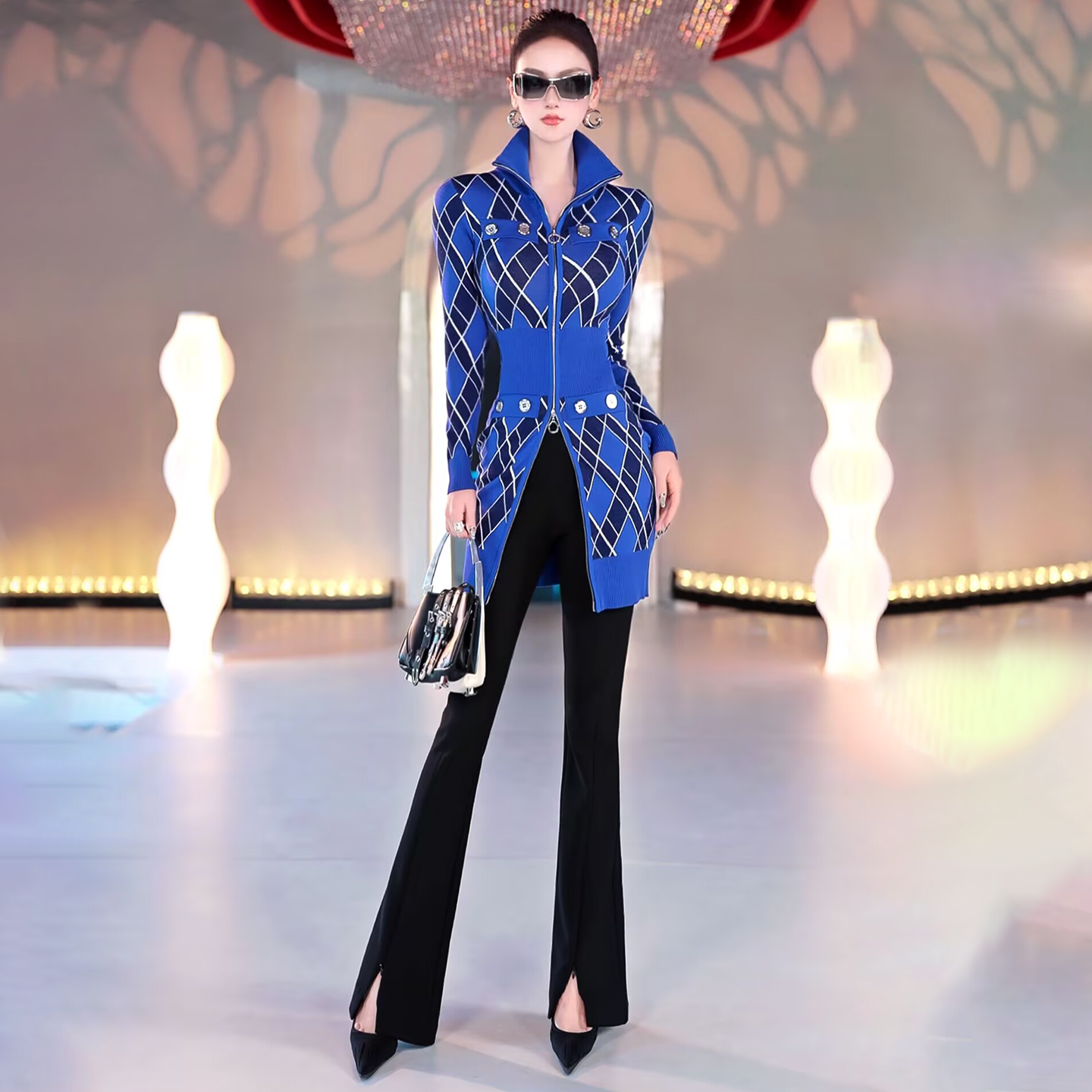 VJE早秋英伦风格纹撞色针织拉链开襟包臀裙2025新款休闲连衣裙