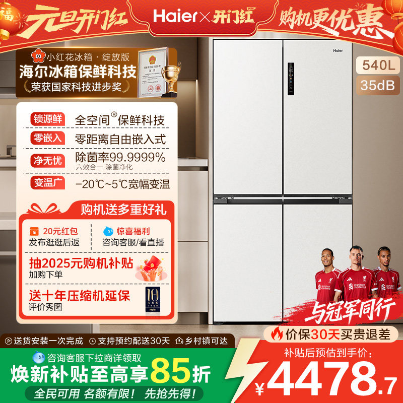 换新补贴海尔小红花540L双开四门一级零嵌入式家用超薄电冰箱新品