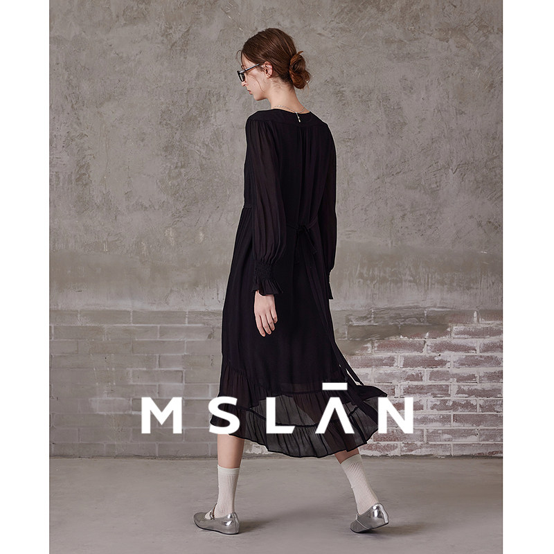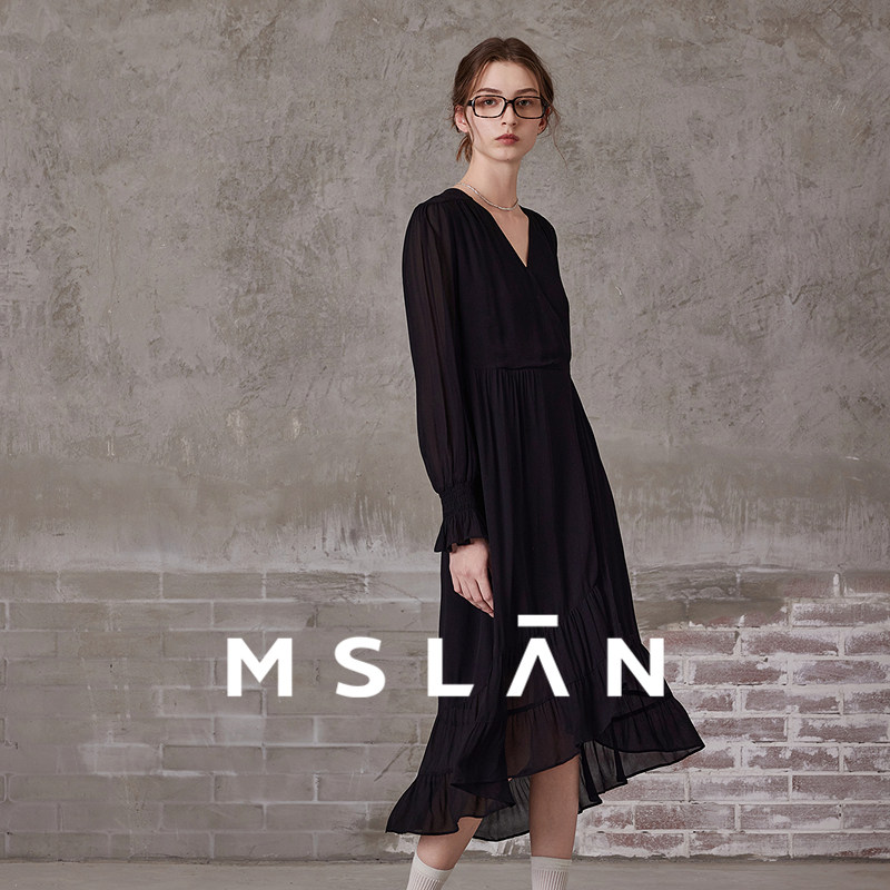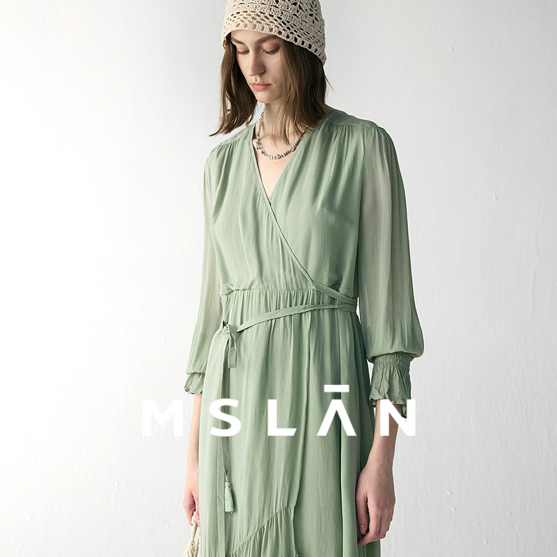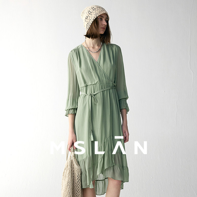 MSLAN流苏腰带 轻氧自然荷叶连衣裙 夏季优雅V领系带收腰茶歇裙