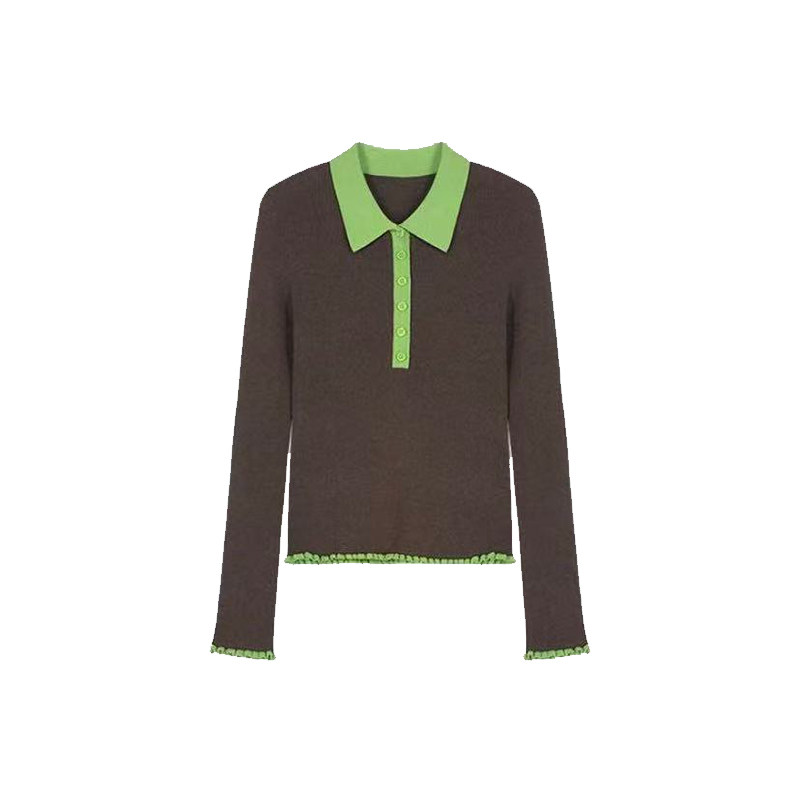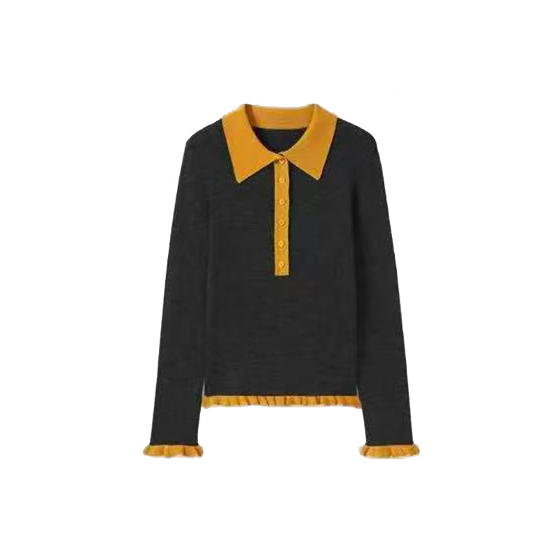 【蜜蜂欢乐社】二茵ERYIN秋冬新款木耳边撞色POLO领长袖打底衫