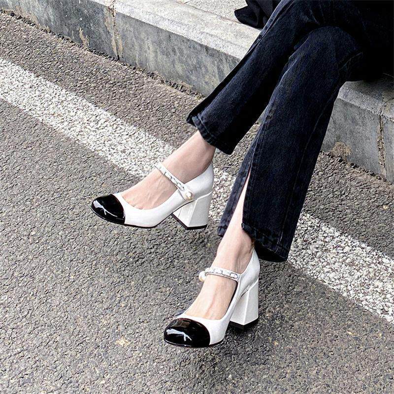 六点大叔真皮粗跟单鞋女2026春季新款珍珠伴娘白色高跟鞋玛丽珍鞋