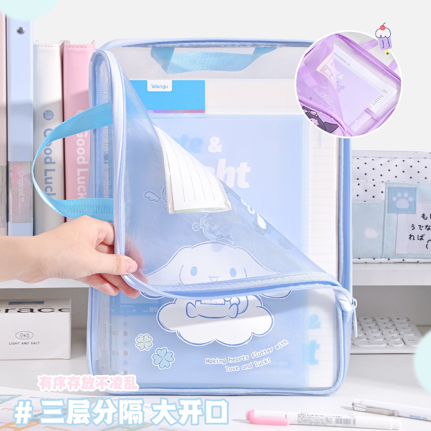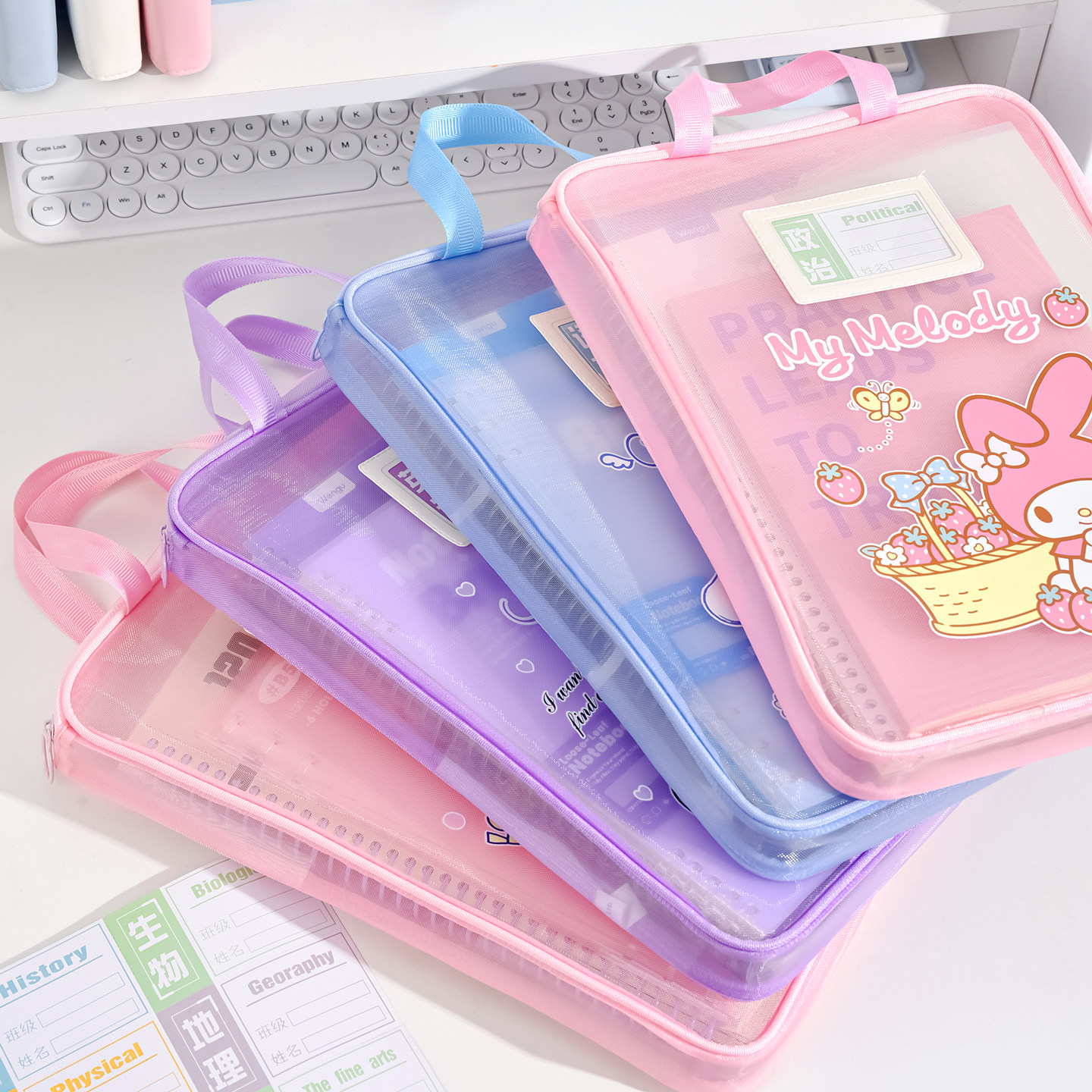 三丽鸥正版授权!库洛米L型科目分类袋透明文件袋拉链式美乐蒂网纱补习手提拎书袋小学生专用书本资料收纳袋