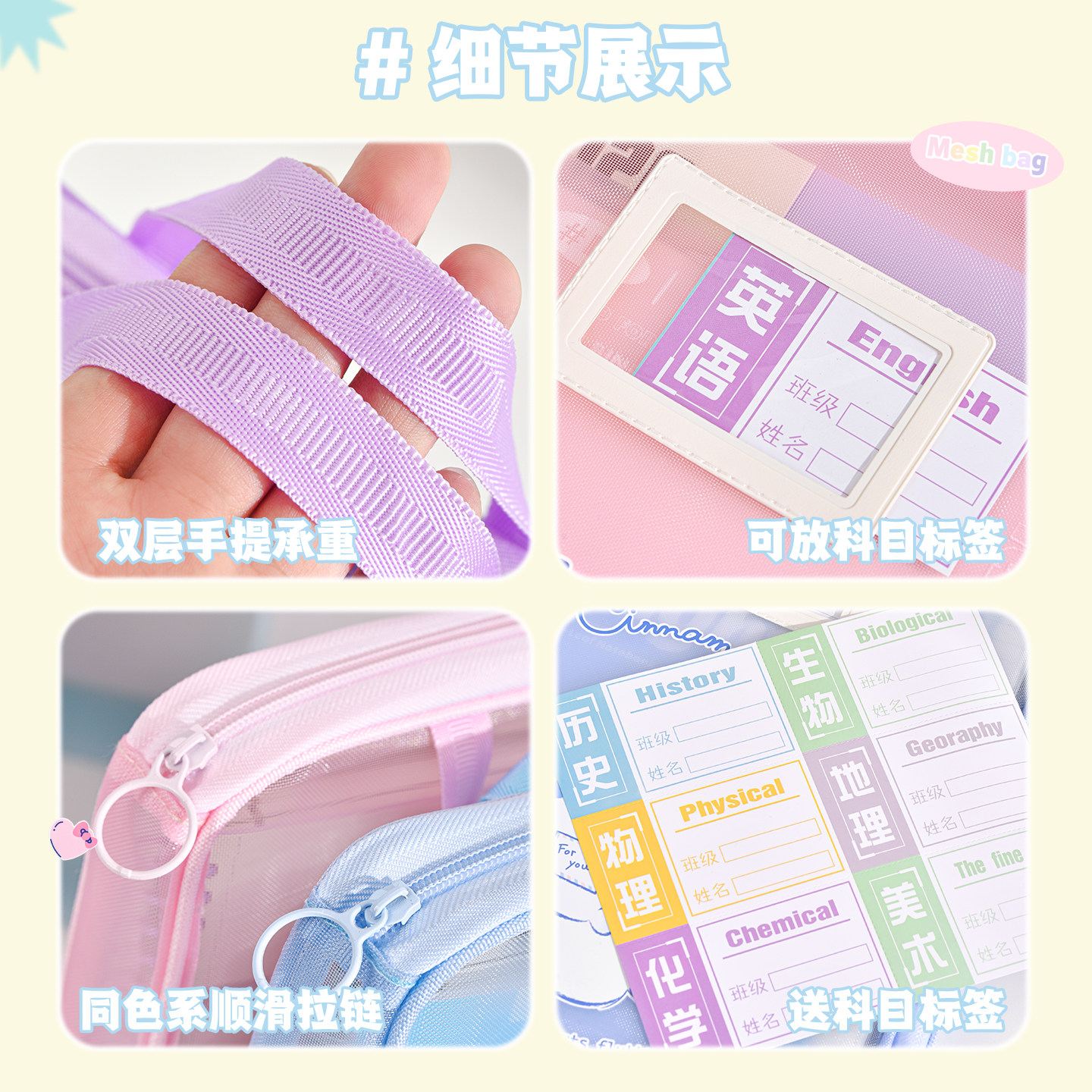 晨光文具学科科目分类袋小学生文件袋拉链式试卷收纳袋透明网纱双层大容量书袋作业资料a4考试专用袋票据产检