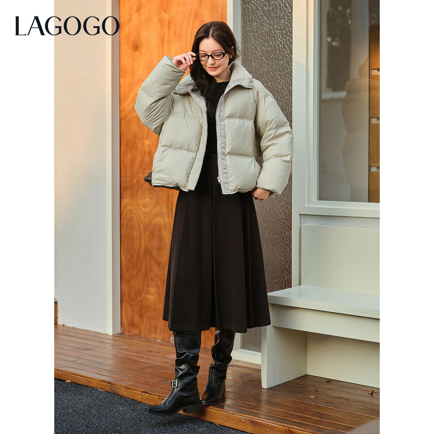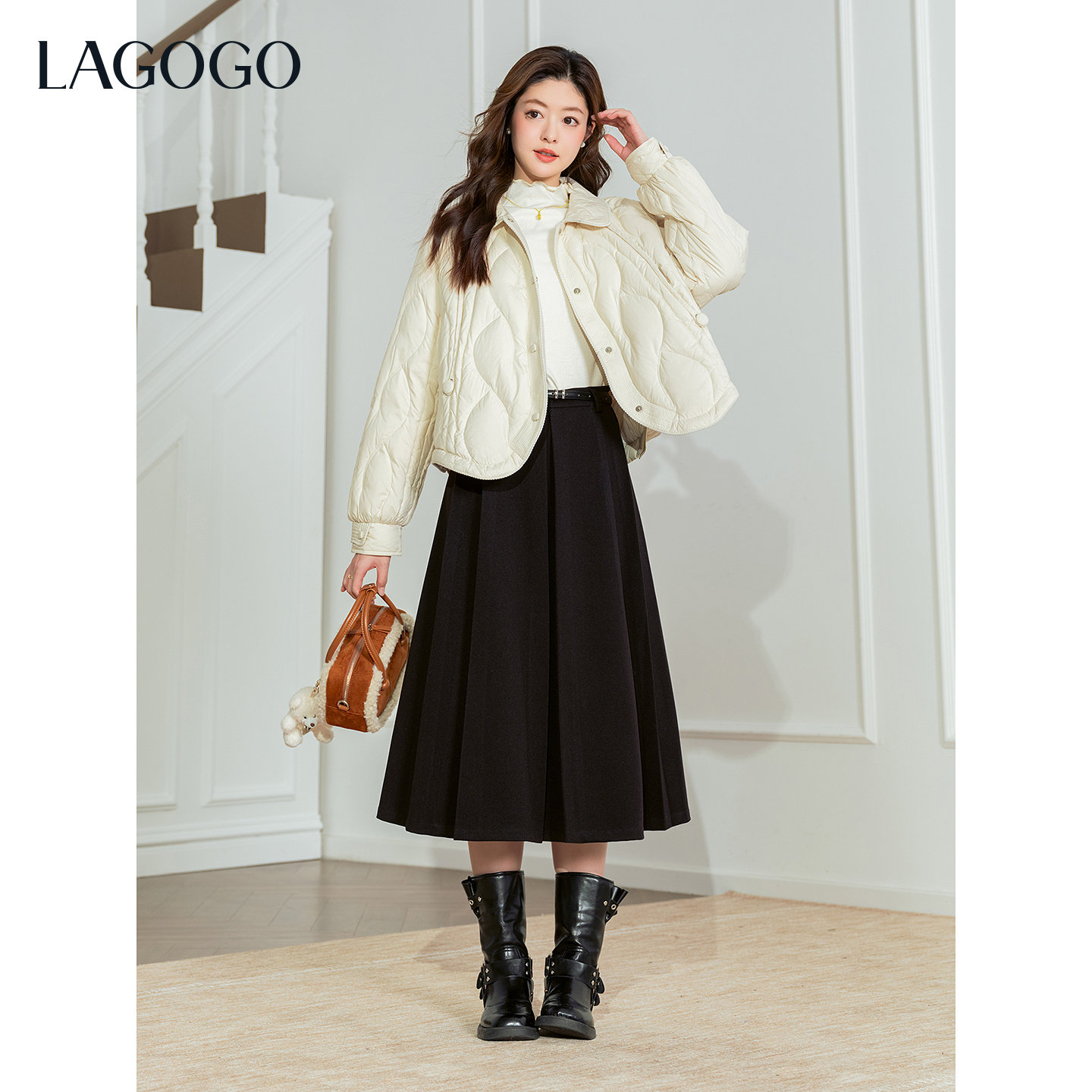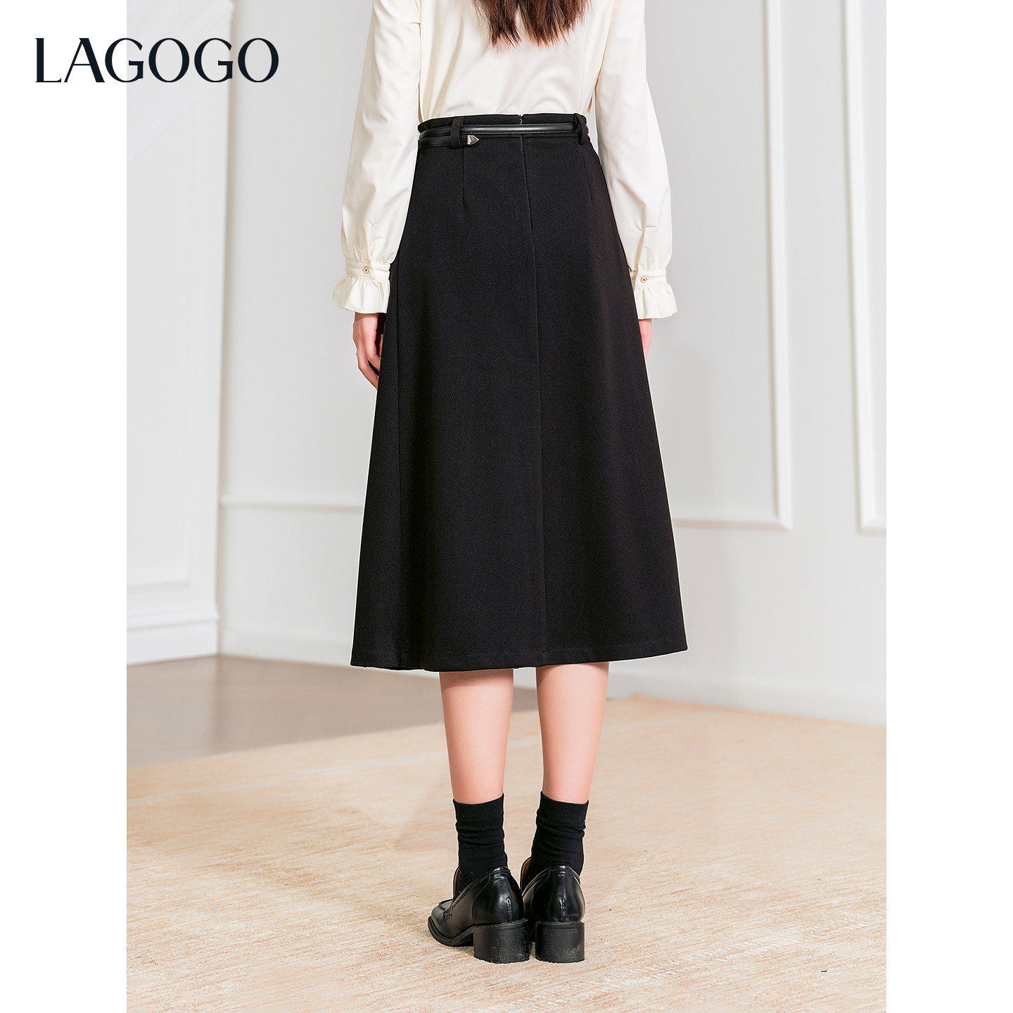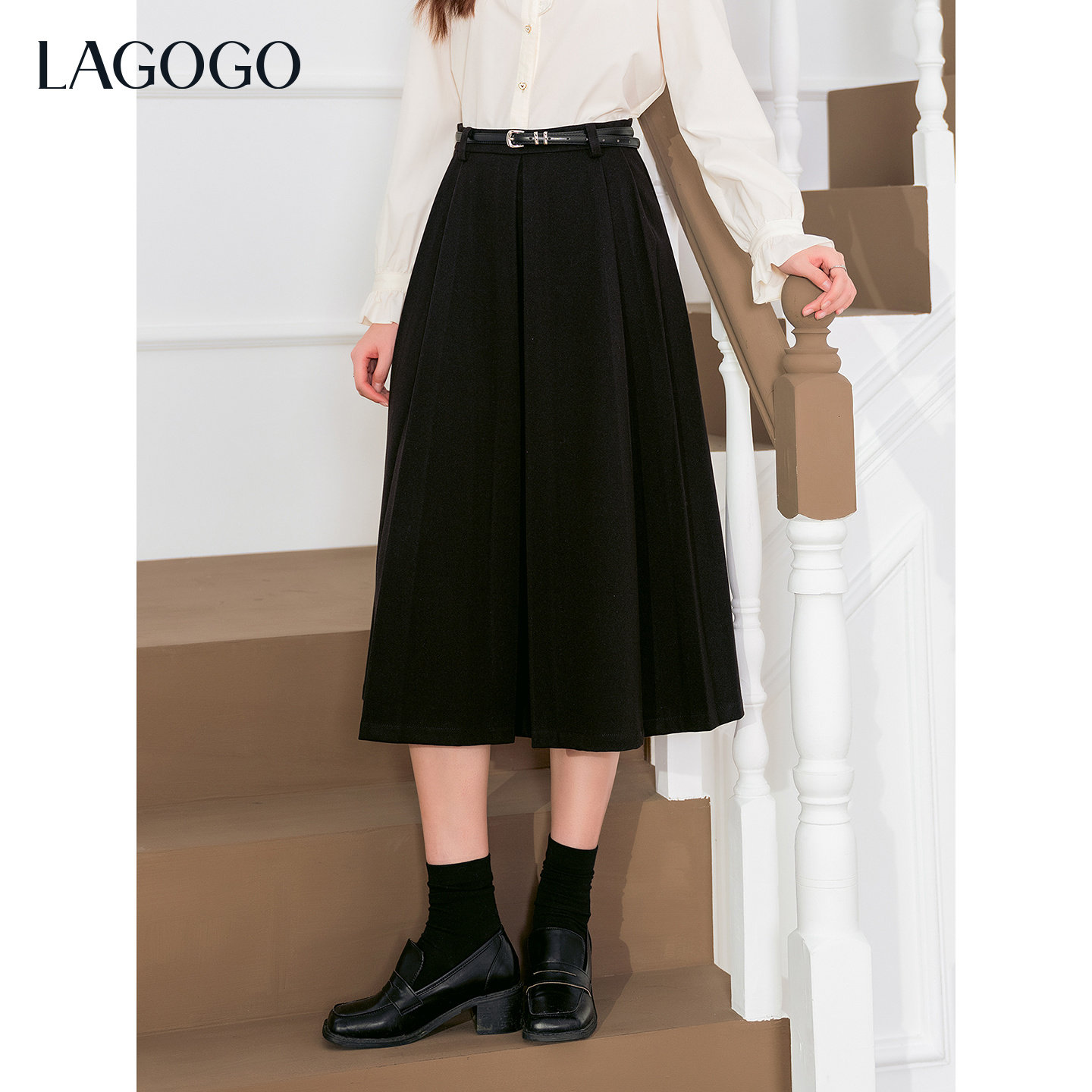 LAGOGO通勤A字百褶半身裙女拉谷谷2025冬新款黑色梨形伯克利裙子