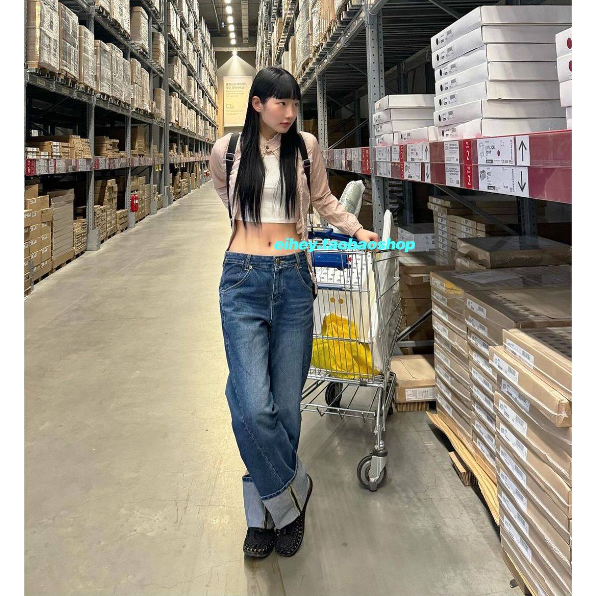 eihey诶嘿新款低腰贴刺绣翻脚卷边阔腿裤牛仔裤女显瘦宽松直筒裤