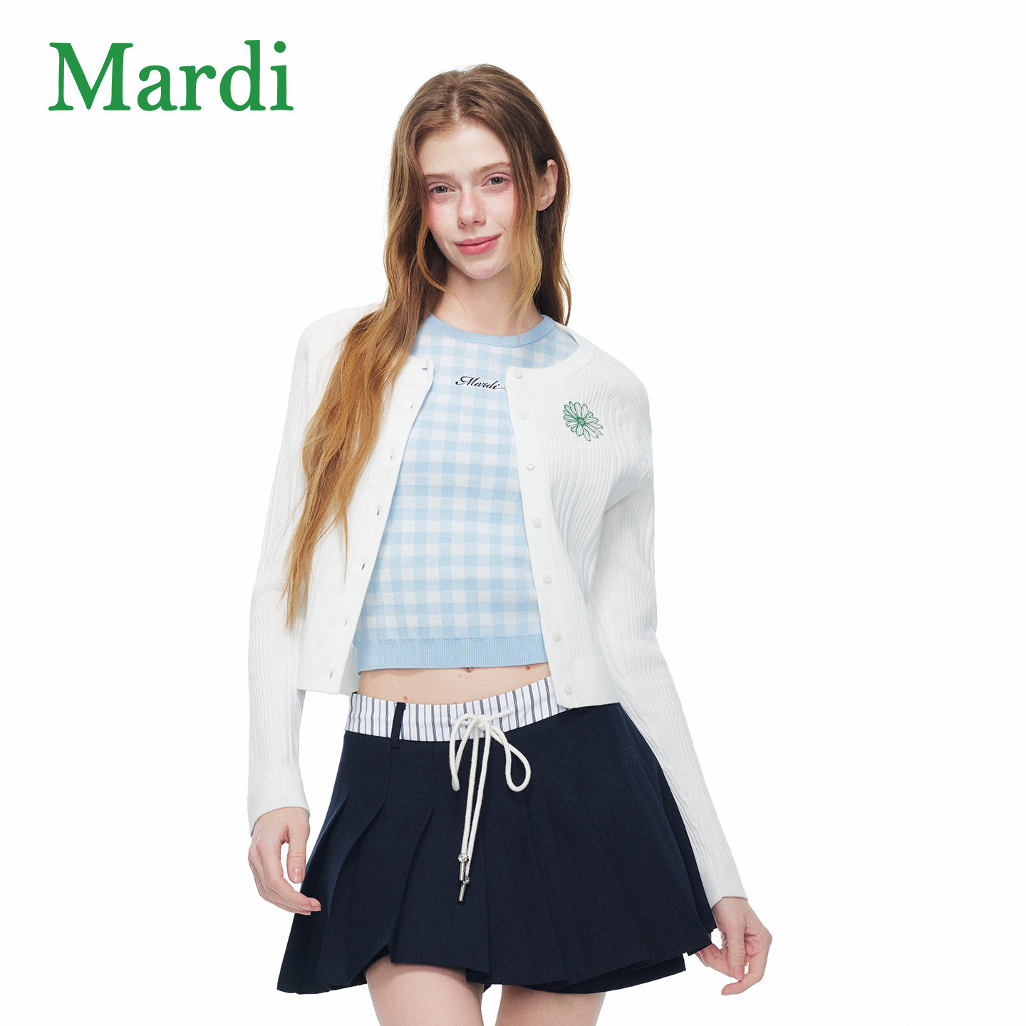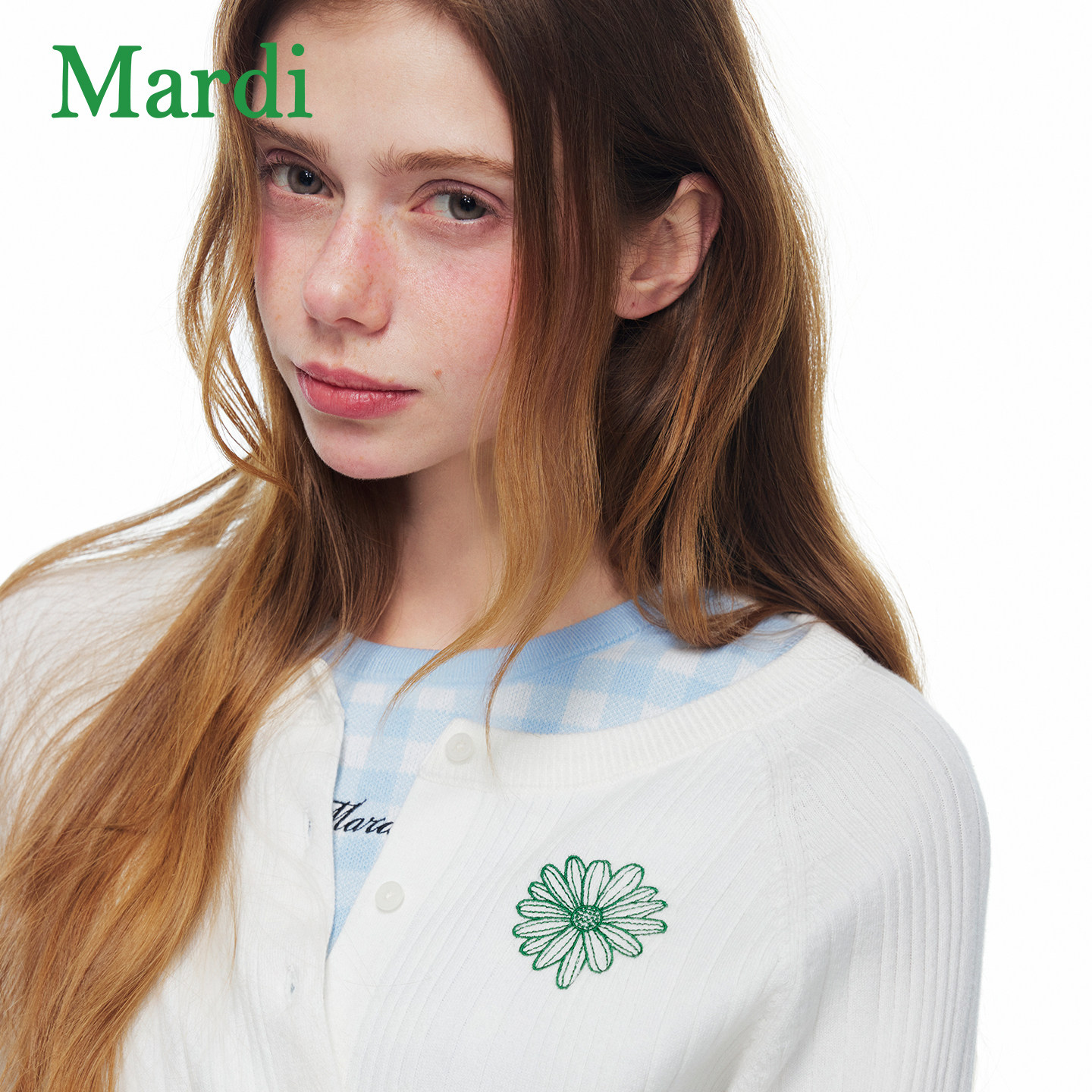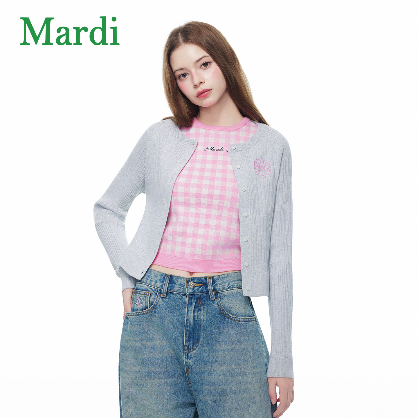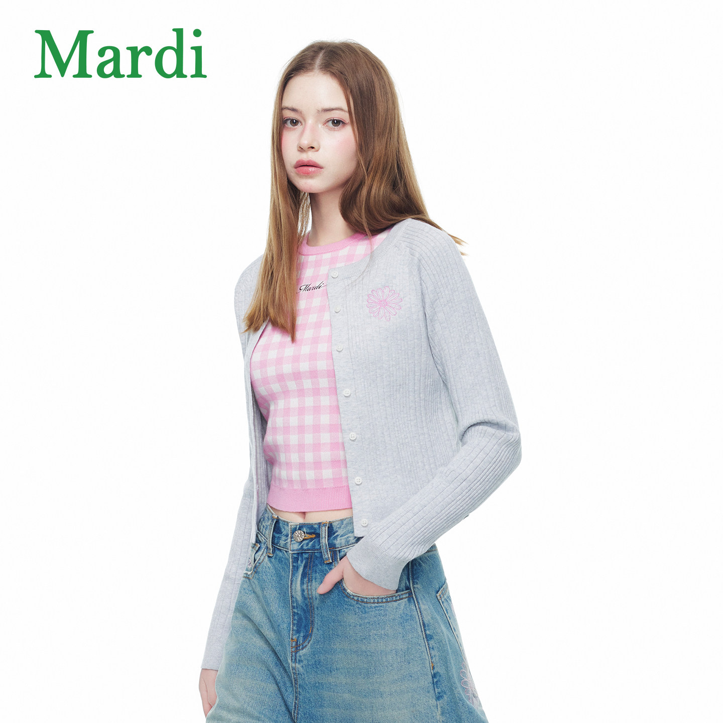MARDI老钱风长袖圆领针织开衫女灰色刺绣纽扣毛衣外套设计感女装