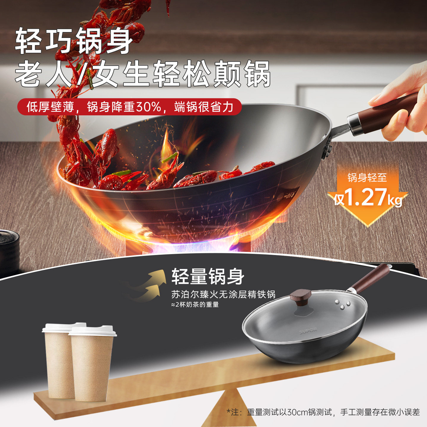 苏泊尔铁锅炒菜锅家用燃气灶圆底老式无涂层炒锅煤气灶专用精铁锅