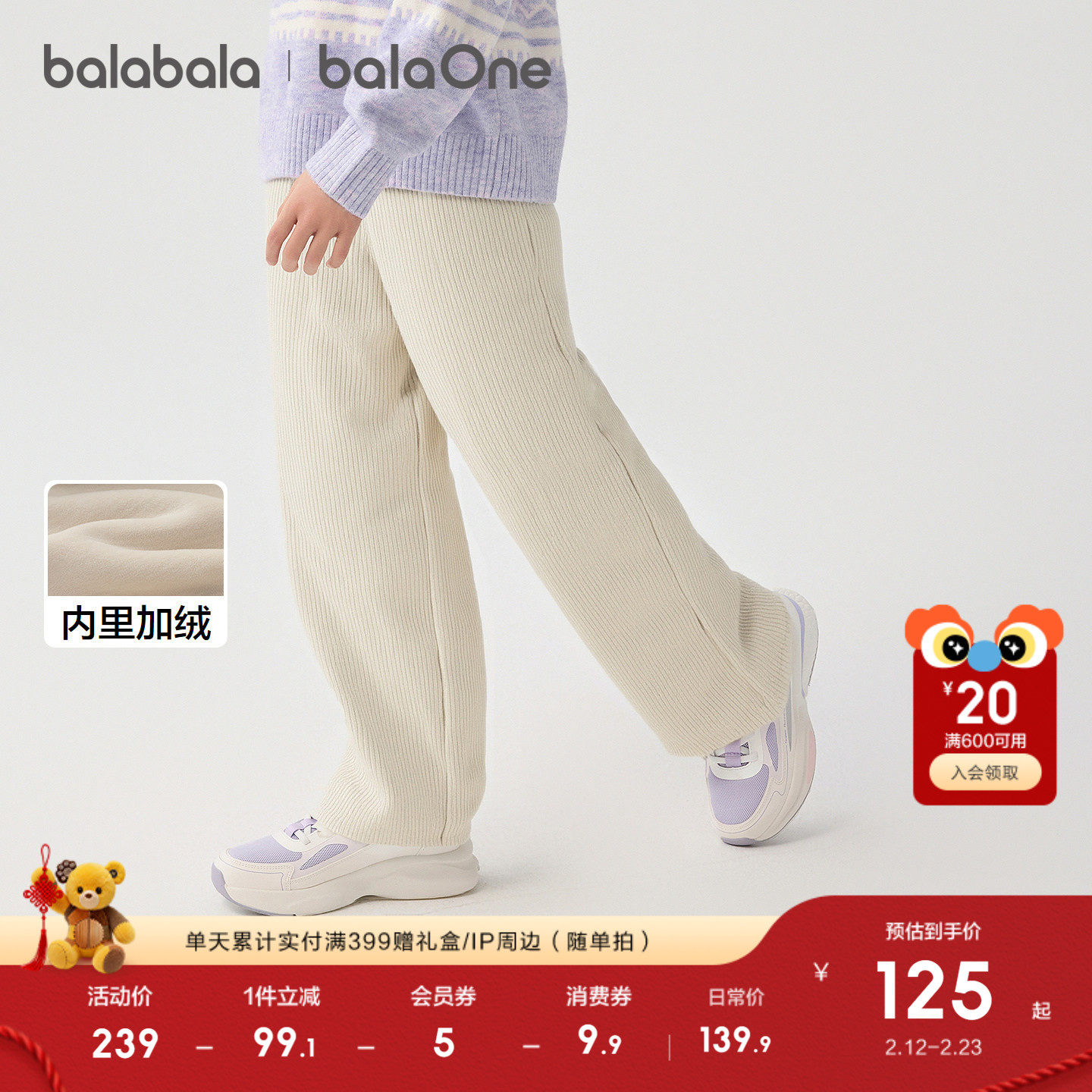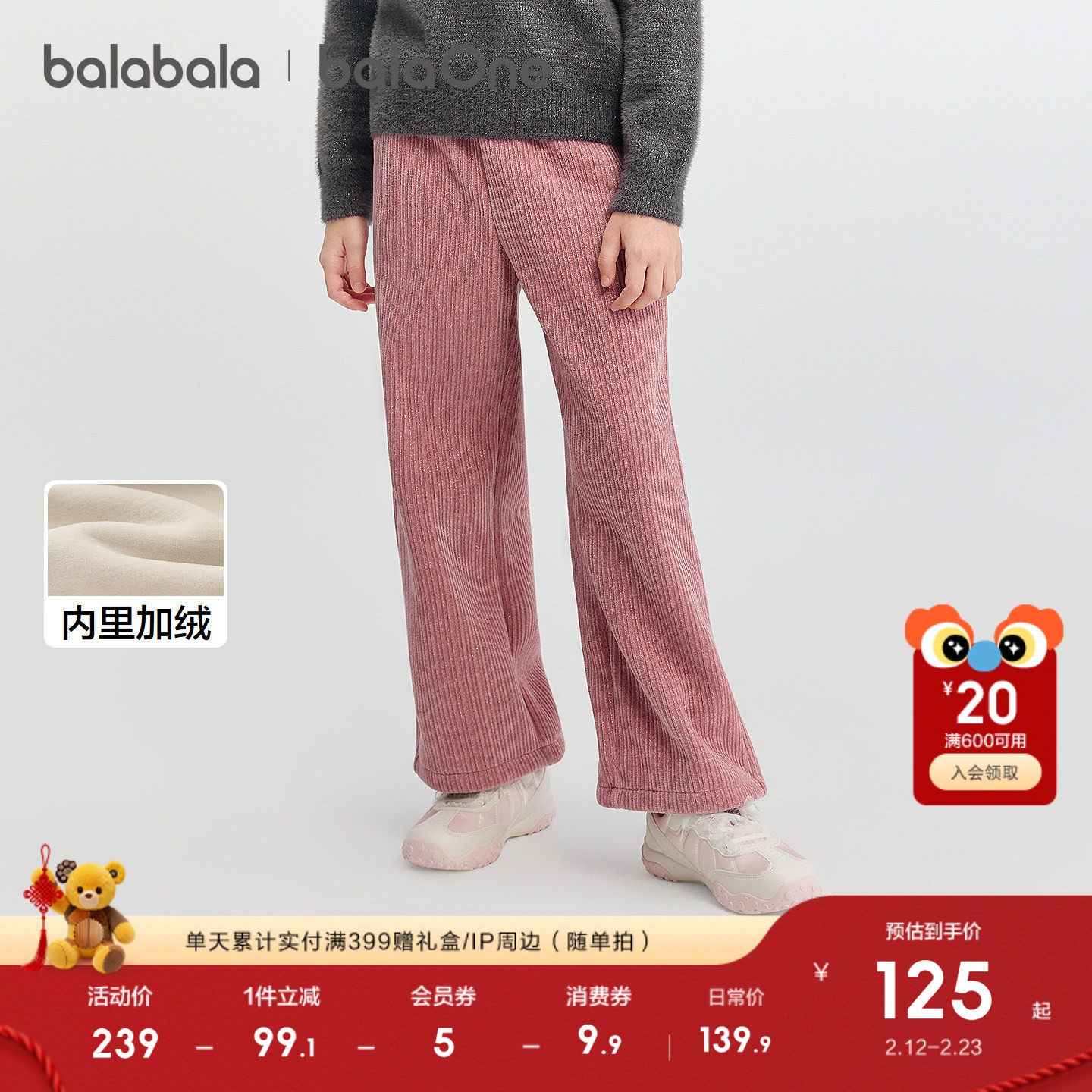 【balaOne】巴拉巴拉童装女童加绒直筒儿童裤子2025冬装新款保暖