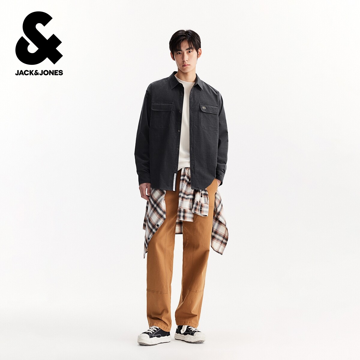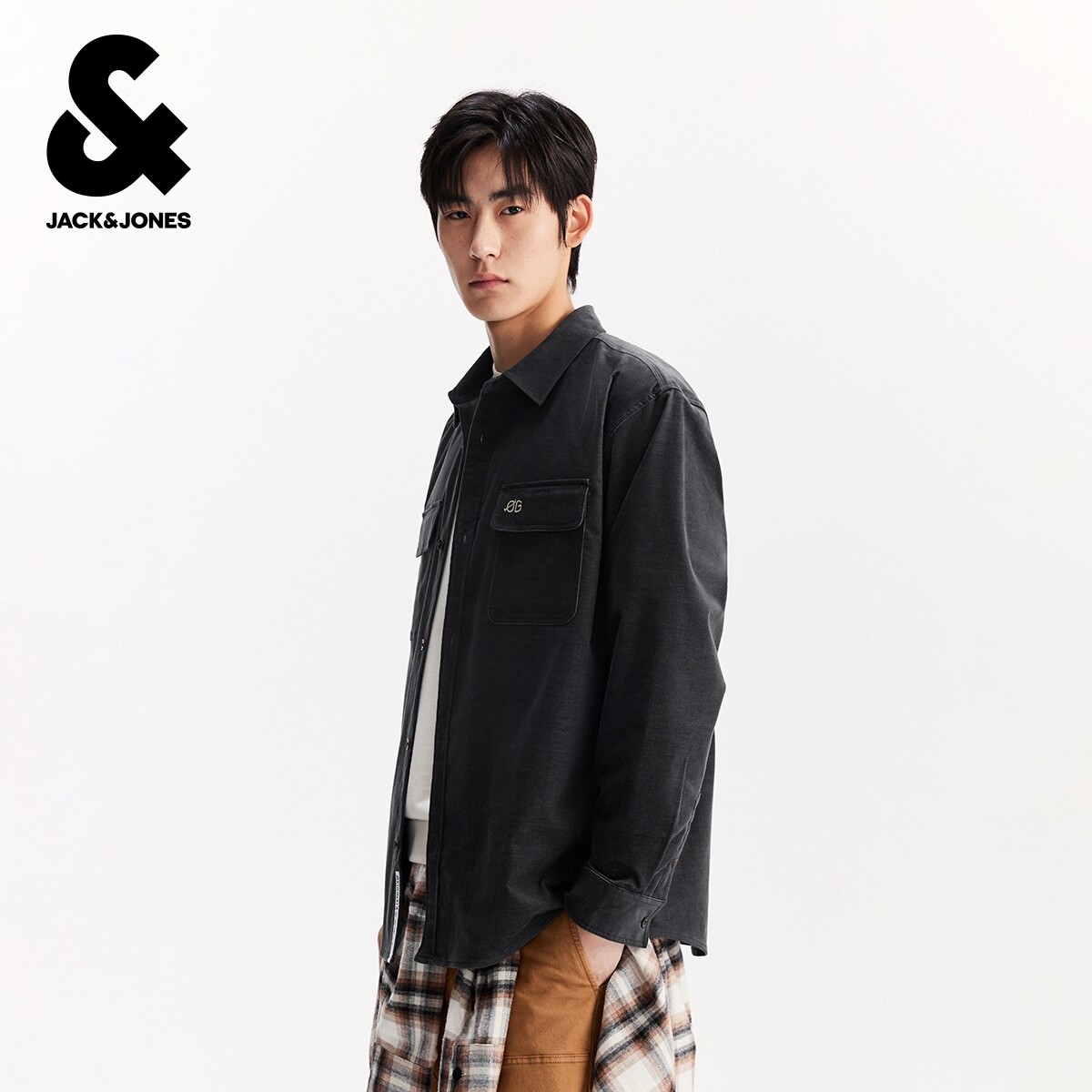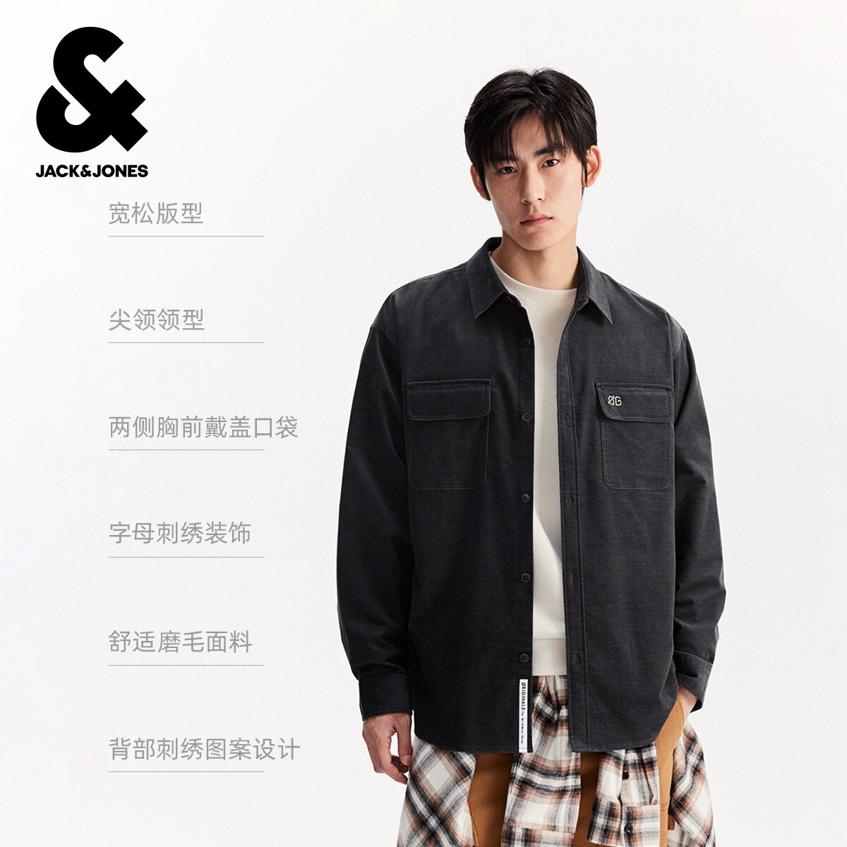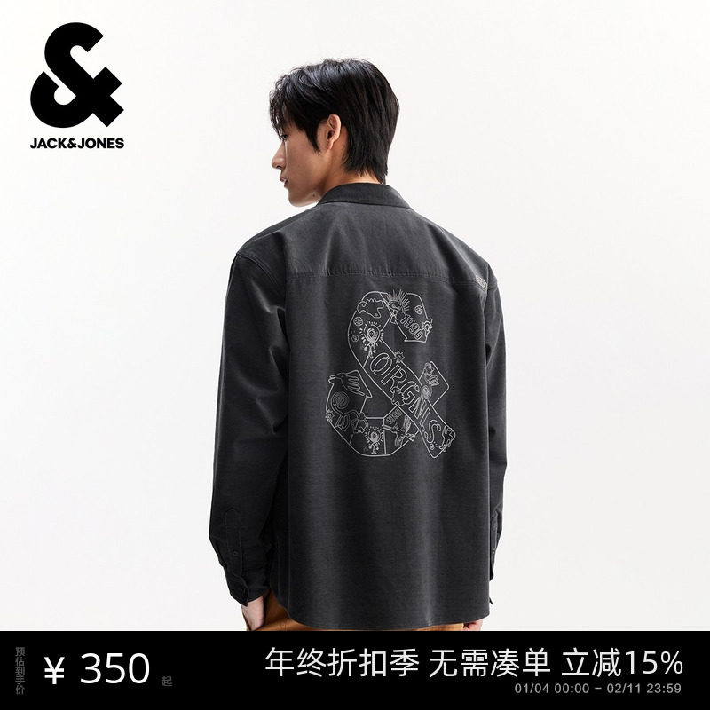 杰克琼斯男装秋冬新款字母刺绣休闲舒适磨毛宽松长袖翻领衬衫外套