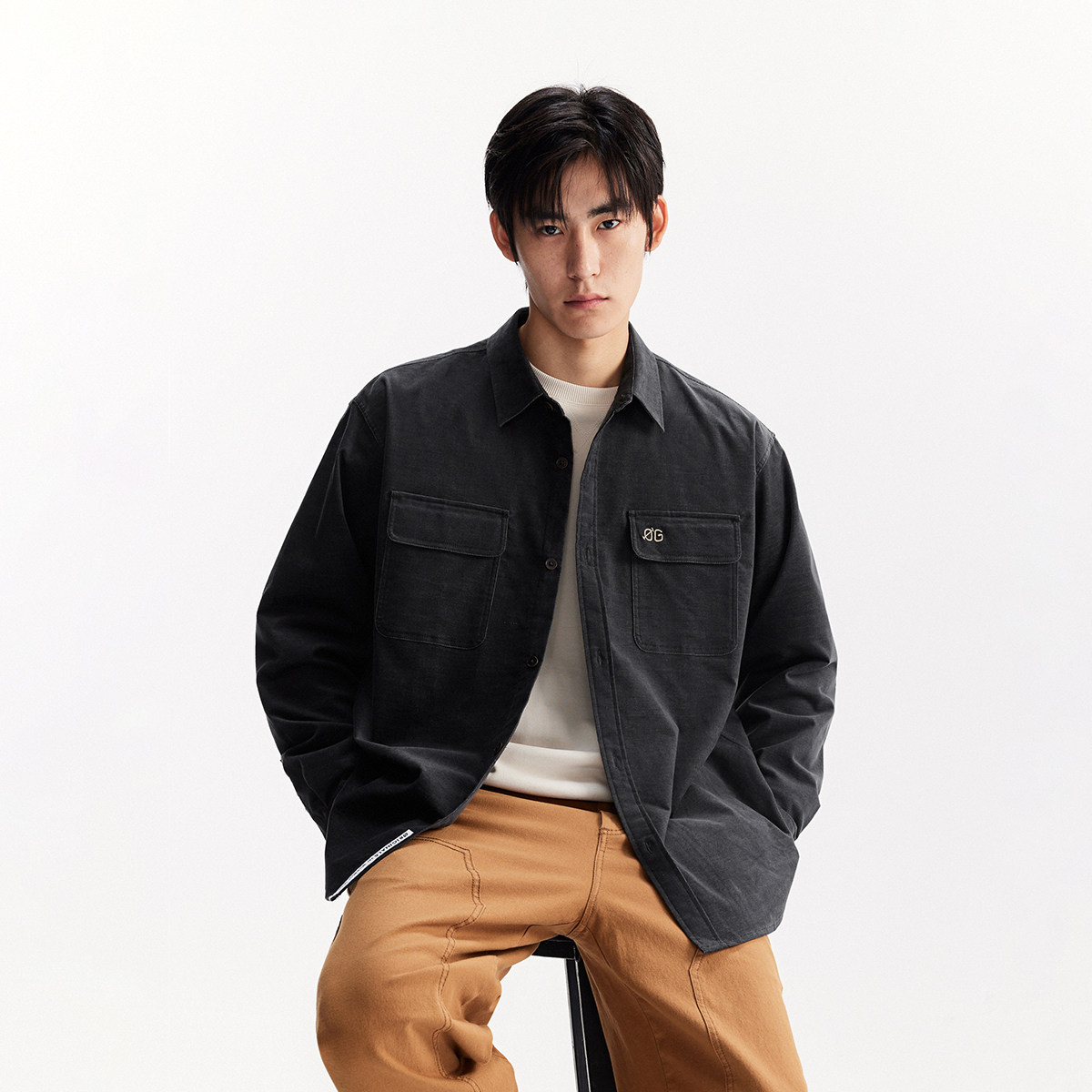 森马长袖衬衫男宽松工装外套情侣款纯色百搭上衣纯棉秋装潮酷流行