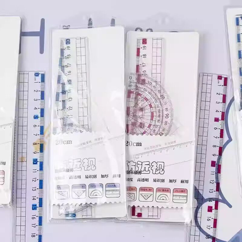 防近视尺子小学生专用套装套尺一年级直尺三角尺量角器文具带波浪线20cm四件套初中生高透