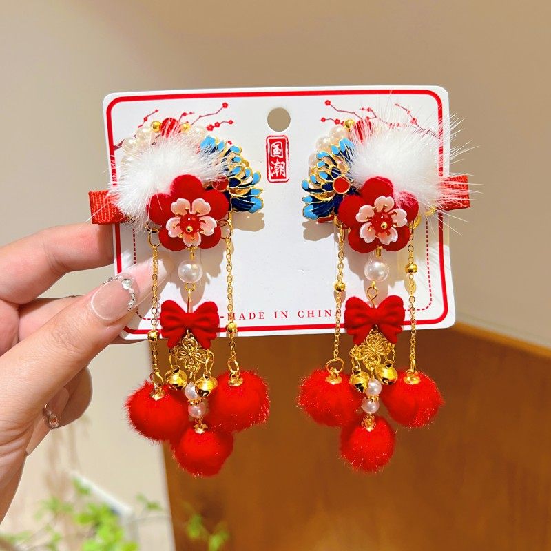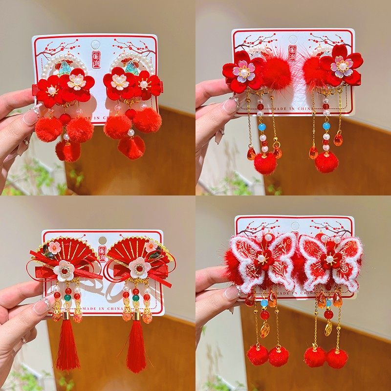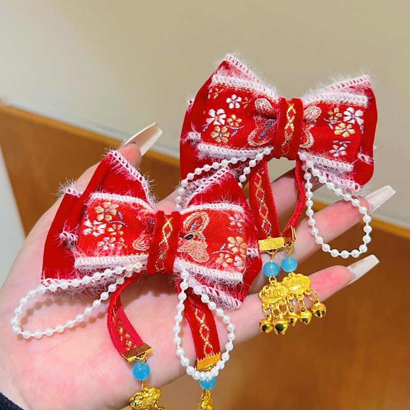 儿童新年大红色喜庆发饰中国风汉服头饰宝宝过年拜年服发夹蝴蝶结