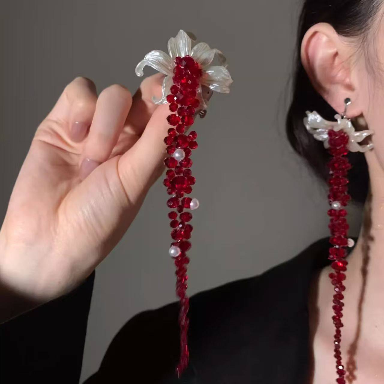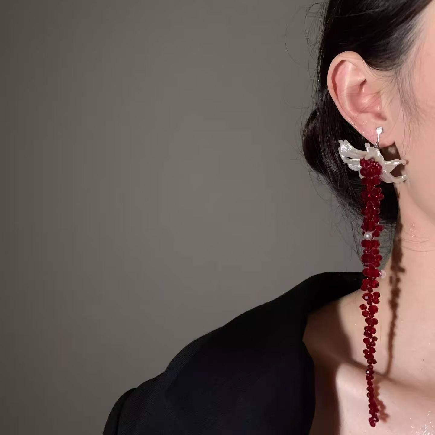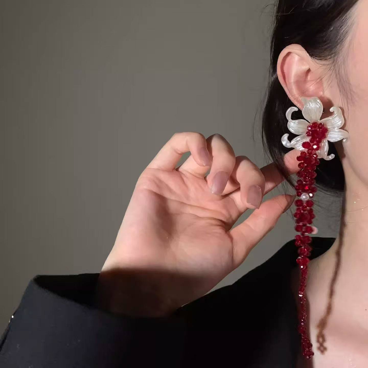 复古独特鸢尾花夸张串珠耳钉女红色红色气质耳环长款流苏耳饰