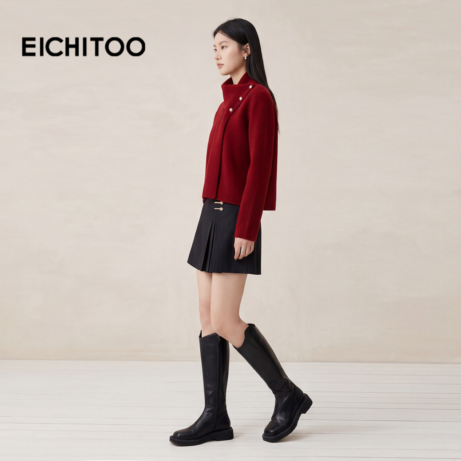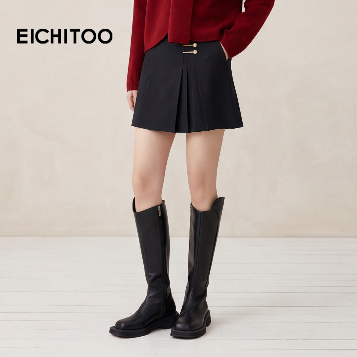 压褶裙摆 金属装饰 穿着干练