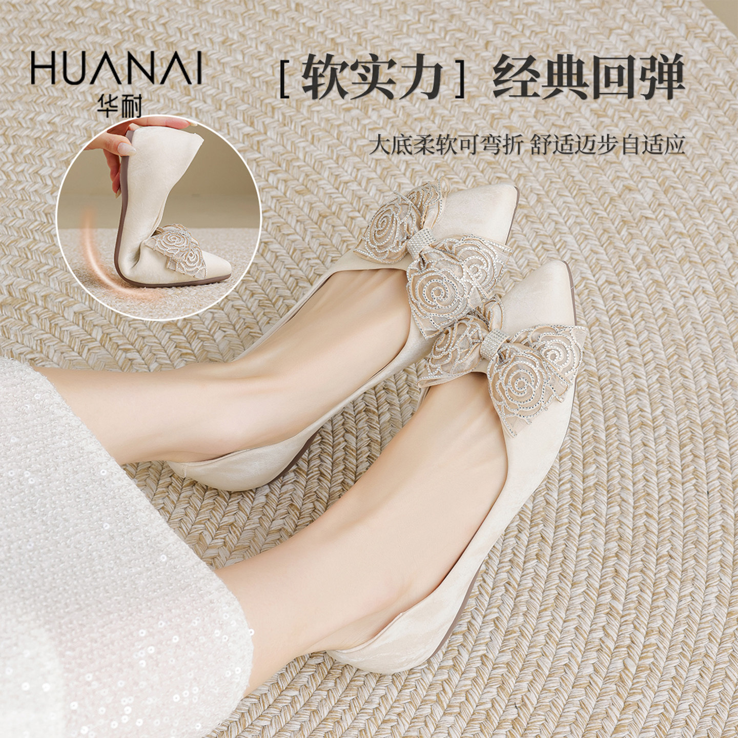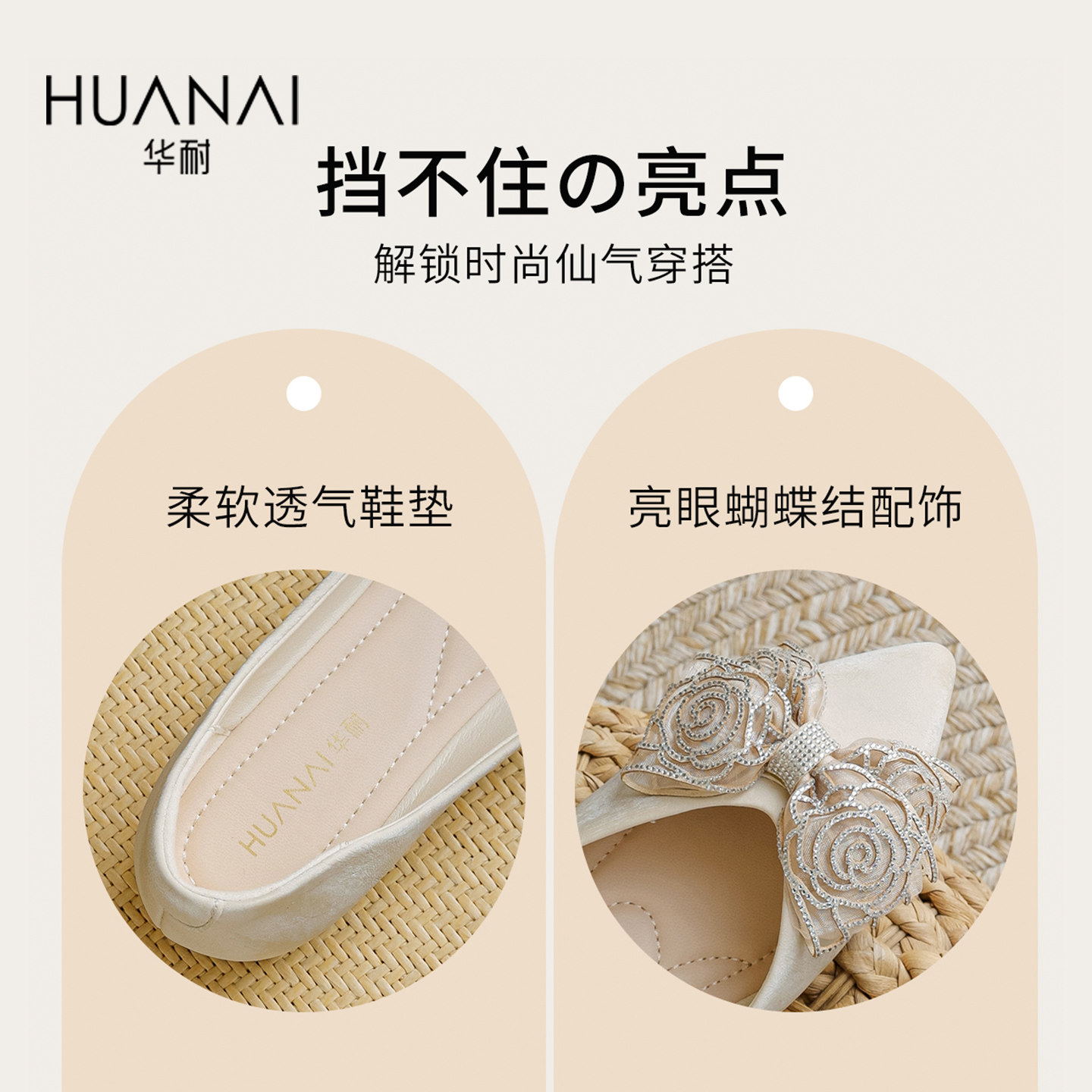 华耐尖头浅口单鞋女2025新款春秋蝴蝶结内增高平底鞋通勤法式女鞋