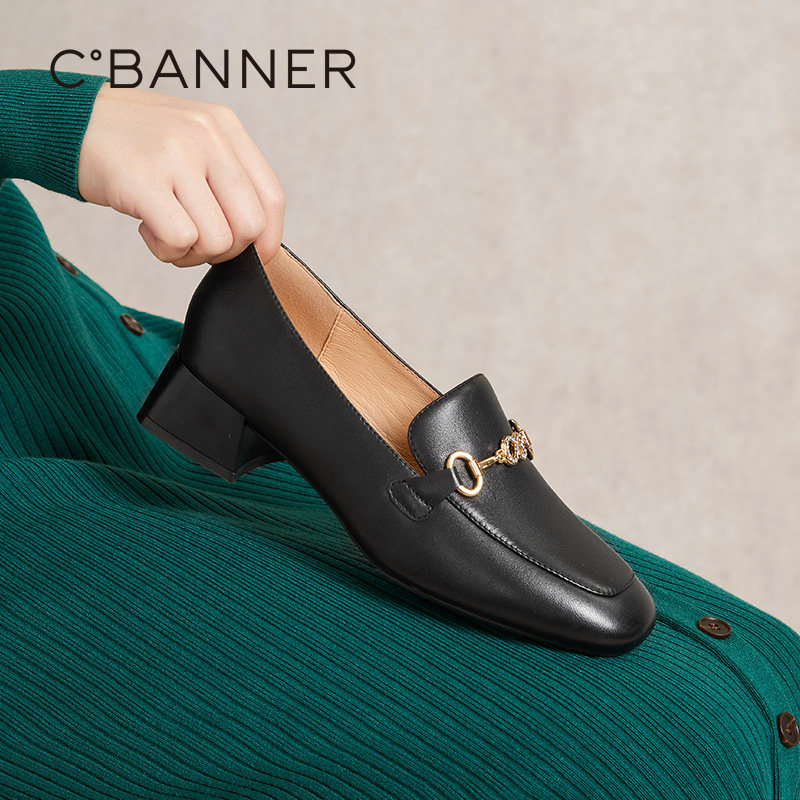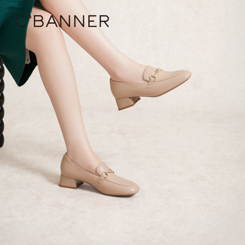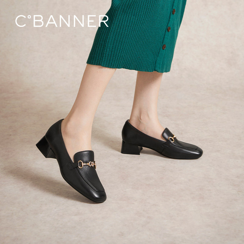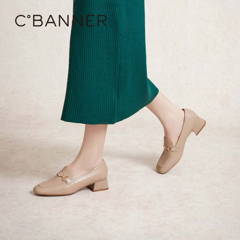 千百度商场同款中跟羊皮乐福鞋秋季通勤小皮鞋方头一脚蹬JK鞋学院