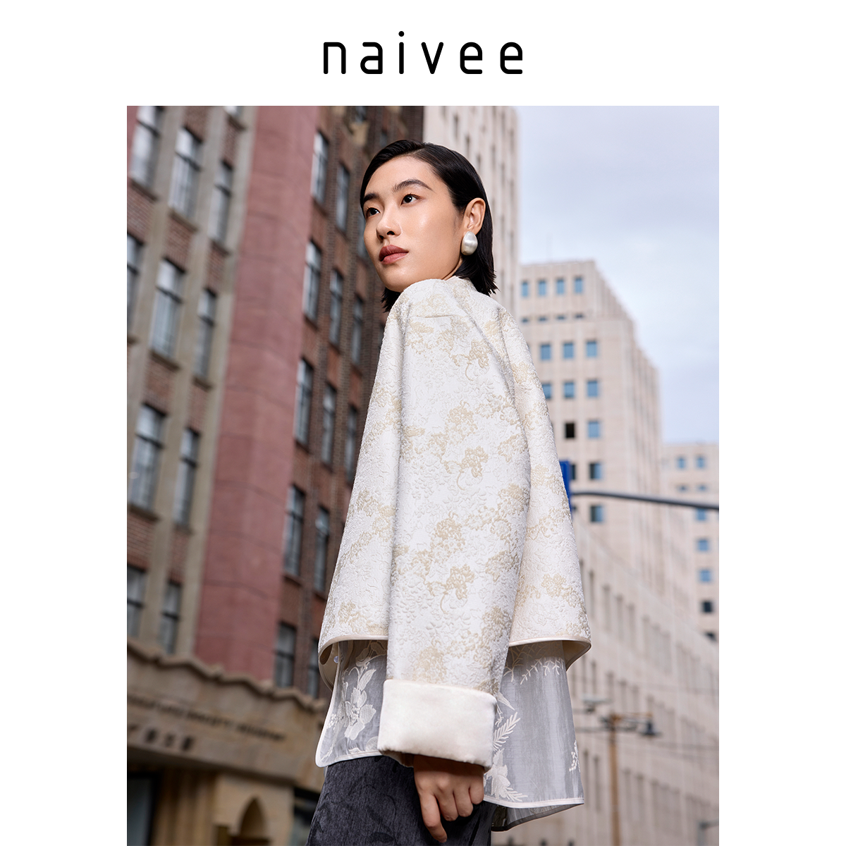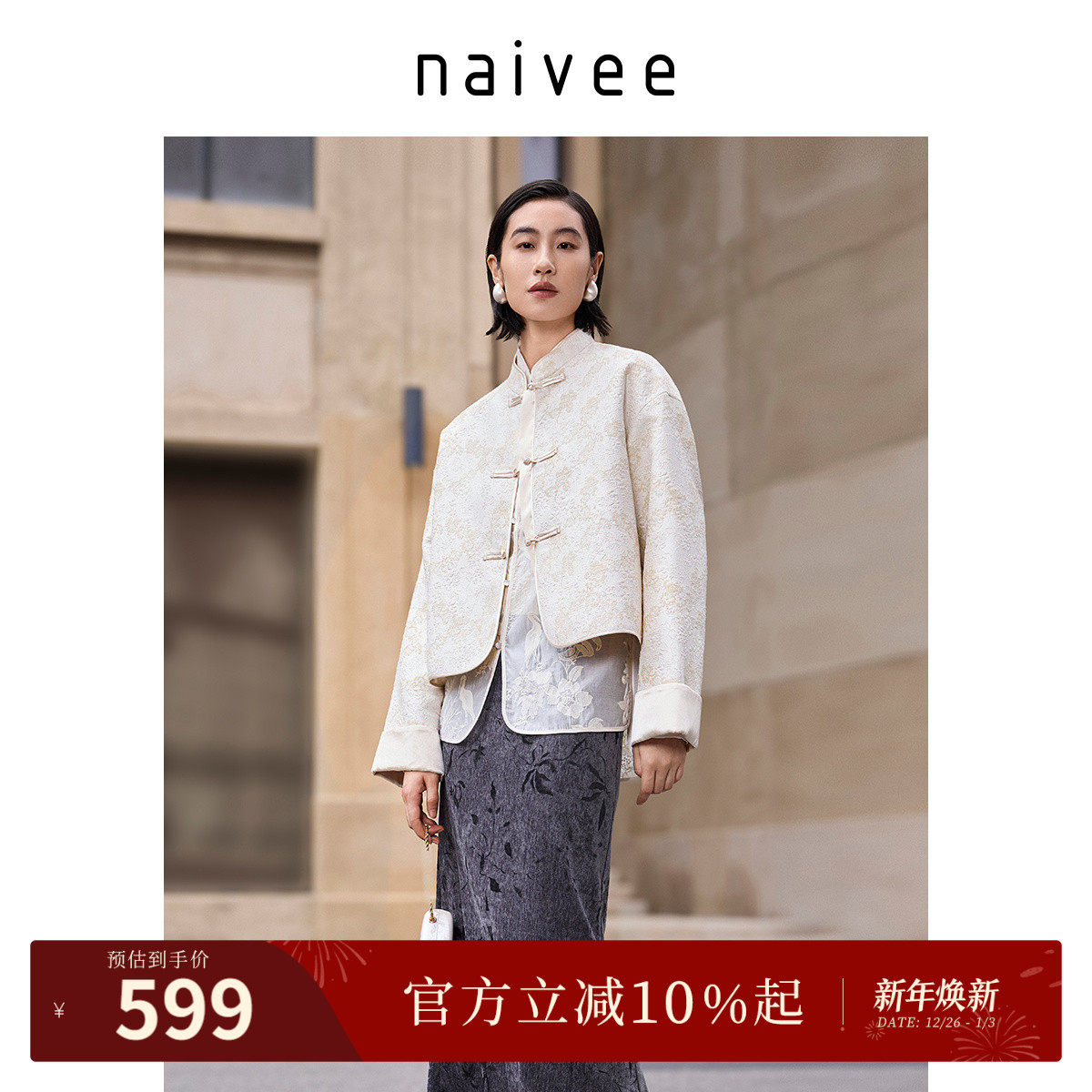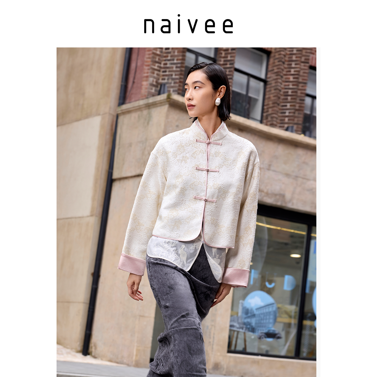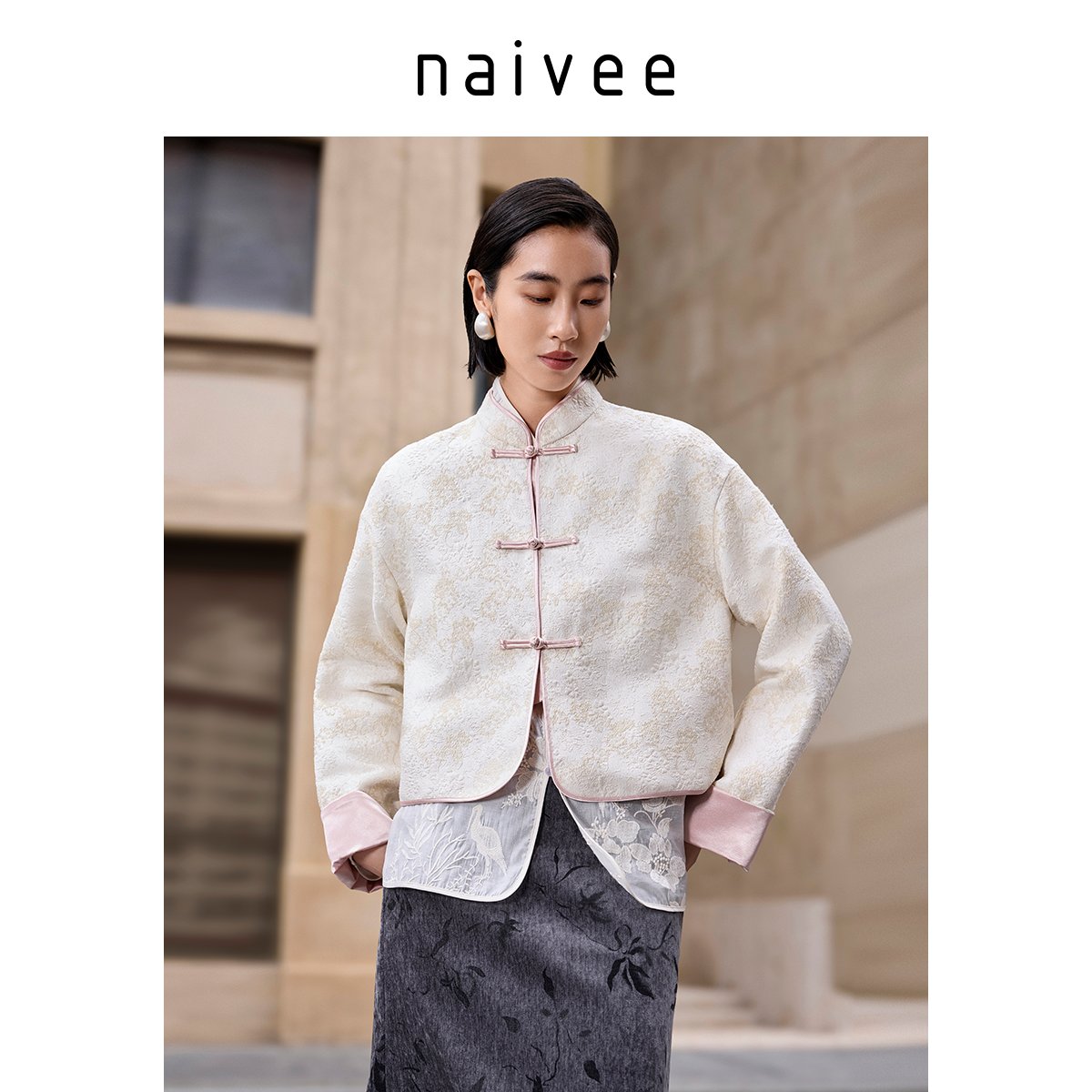 naivee纳薇秋冬新中式国风对襟立领提花宽松上衣精致短外套女时尚