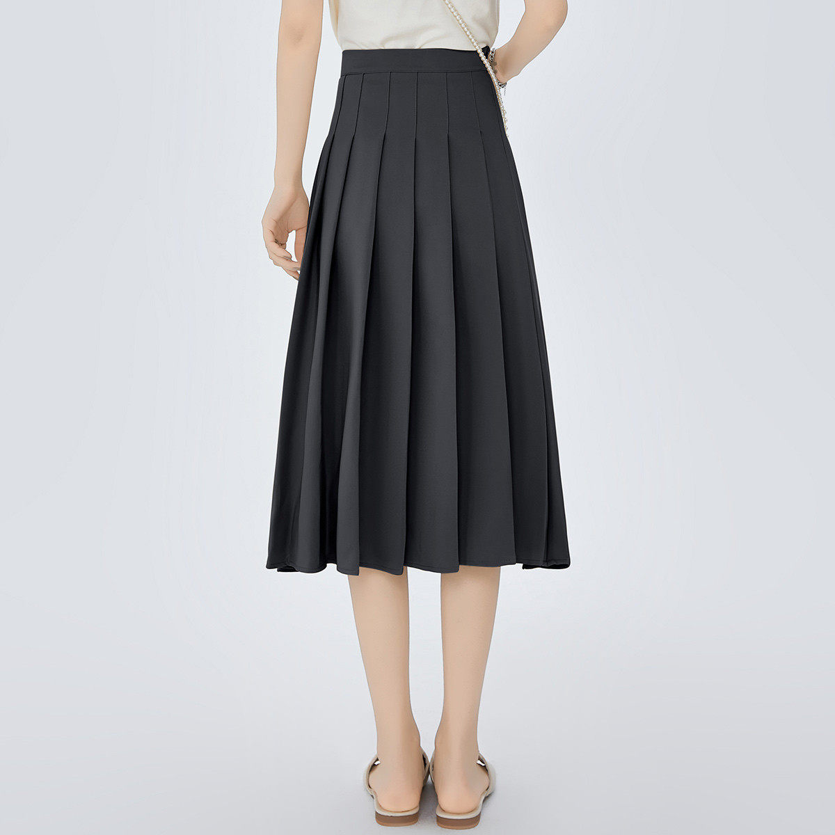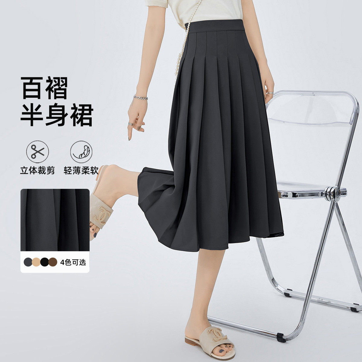 one more2026年春季高腰百褶半身裙女黑色中长款轻熟风百搭大摆裙