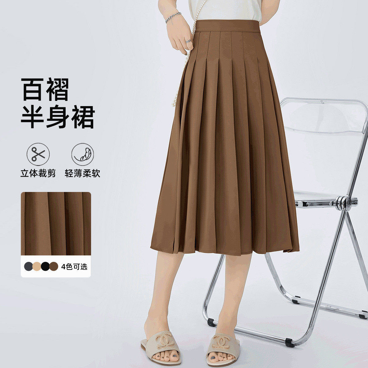 她池松紧腰百褶裙2025秋装新款女装时尚简约中长款A字高腰半身裙
