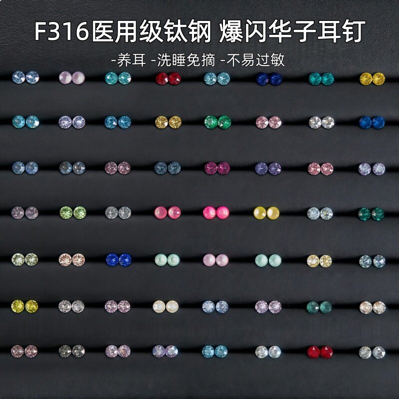 6mm爆闪华子耳钉医用级钛钢养耳洞耳骨耳蜗钉睡觉免摘防过敏耳饰~