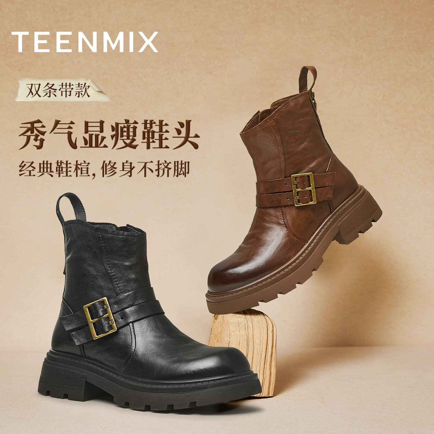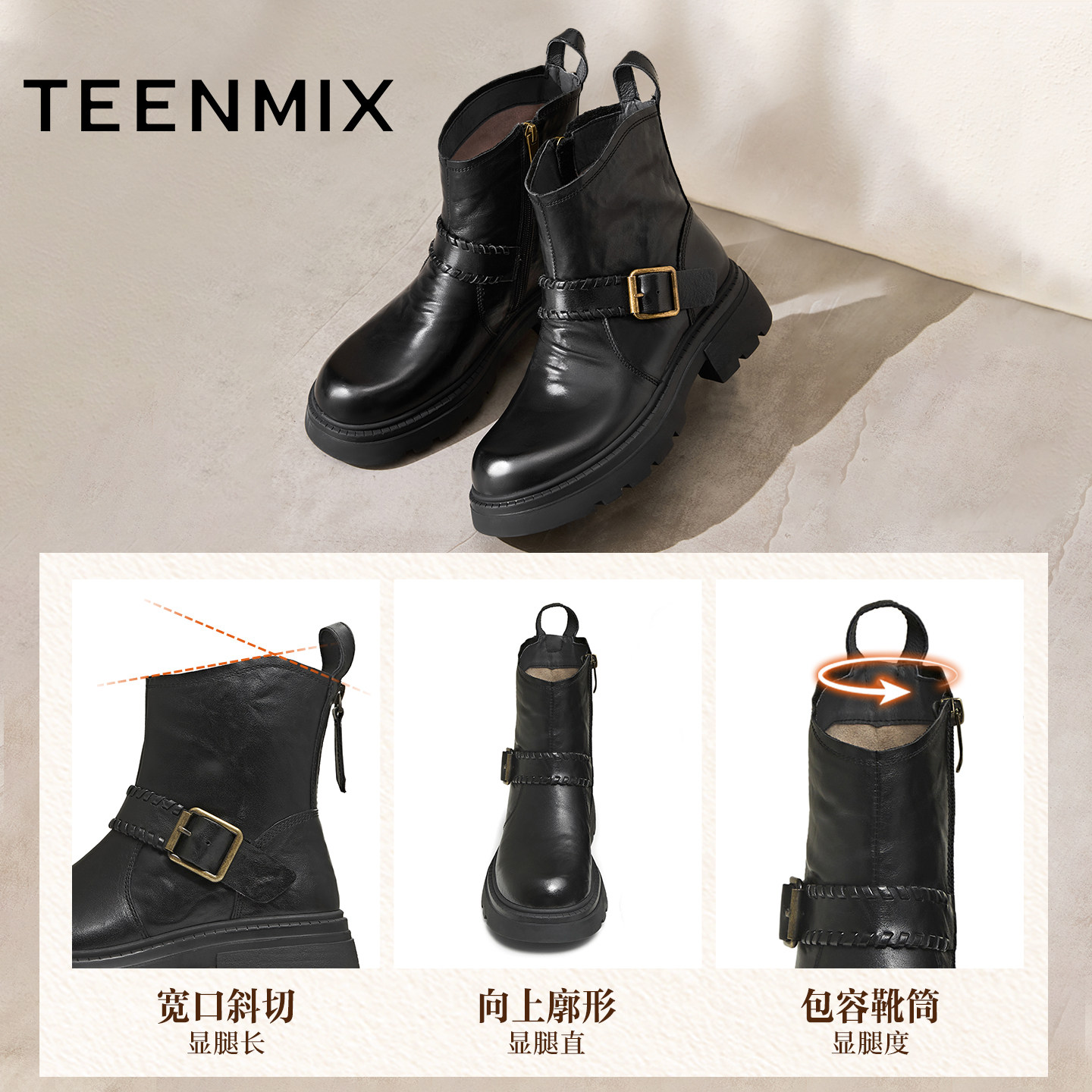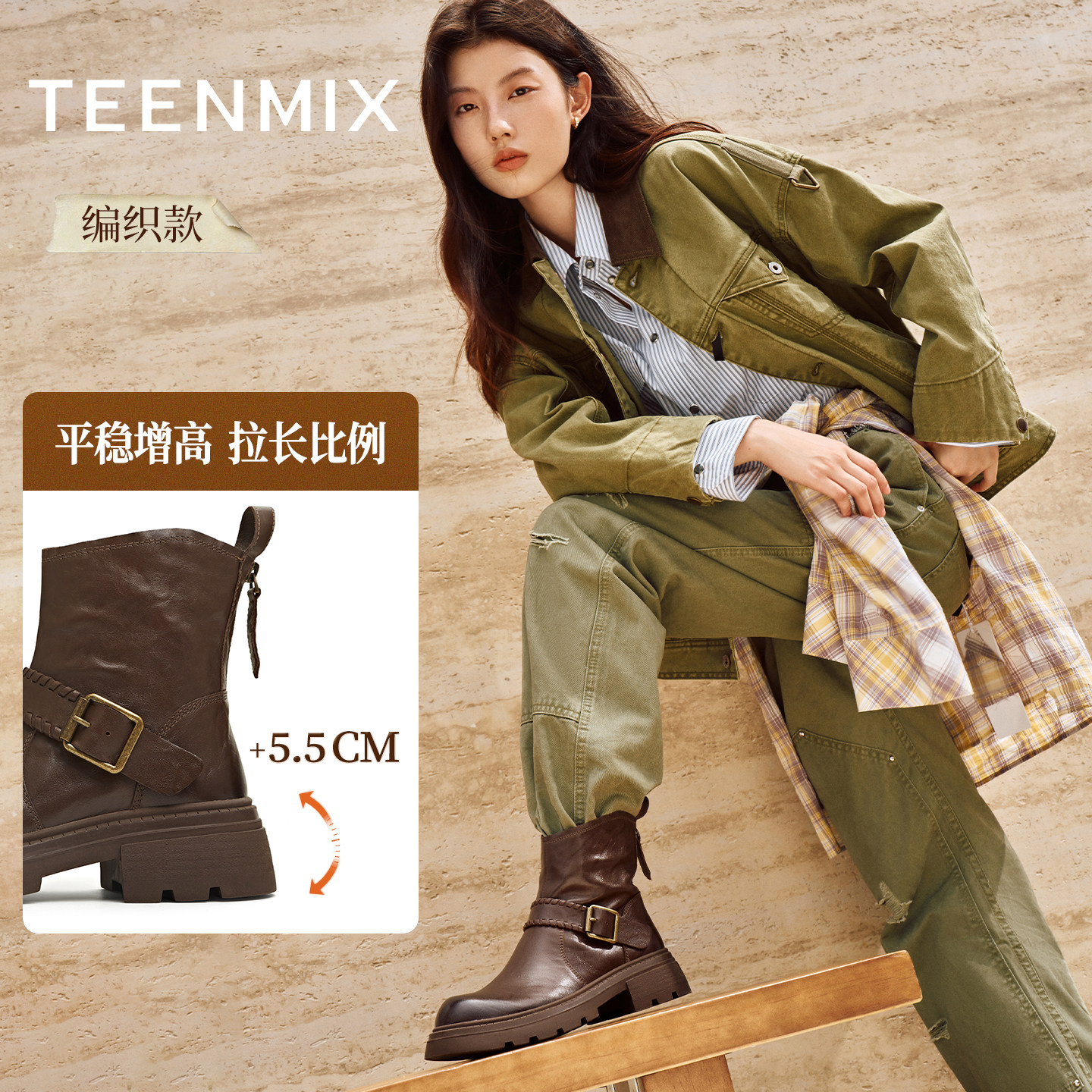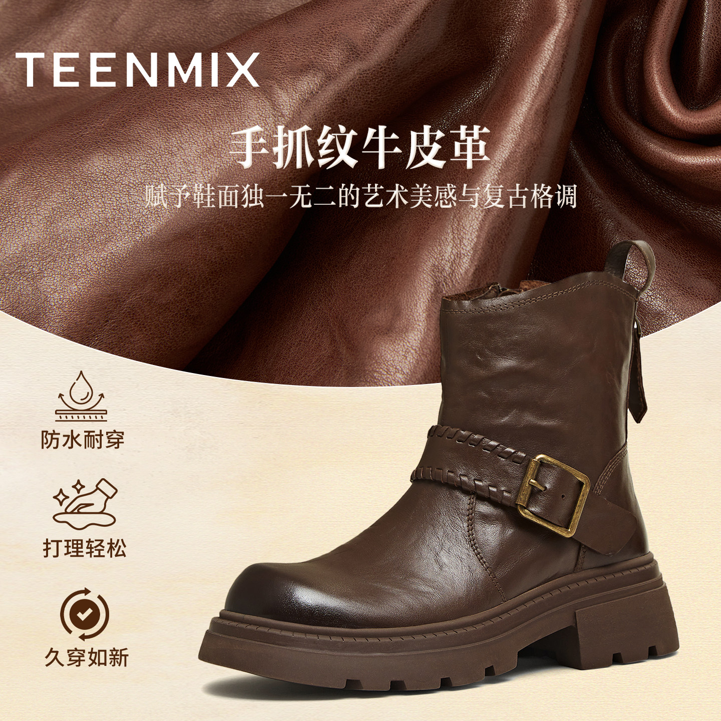 天美意复古厚底加绒西部靴骑士靴女鞋子冬新款休闲时装靴短靴皮靴