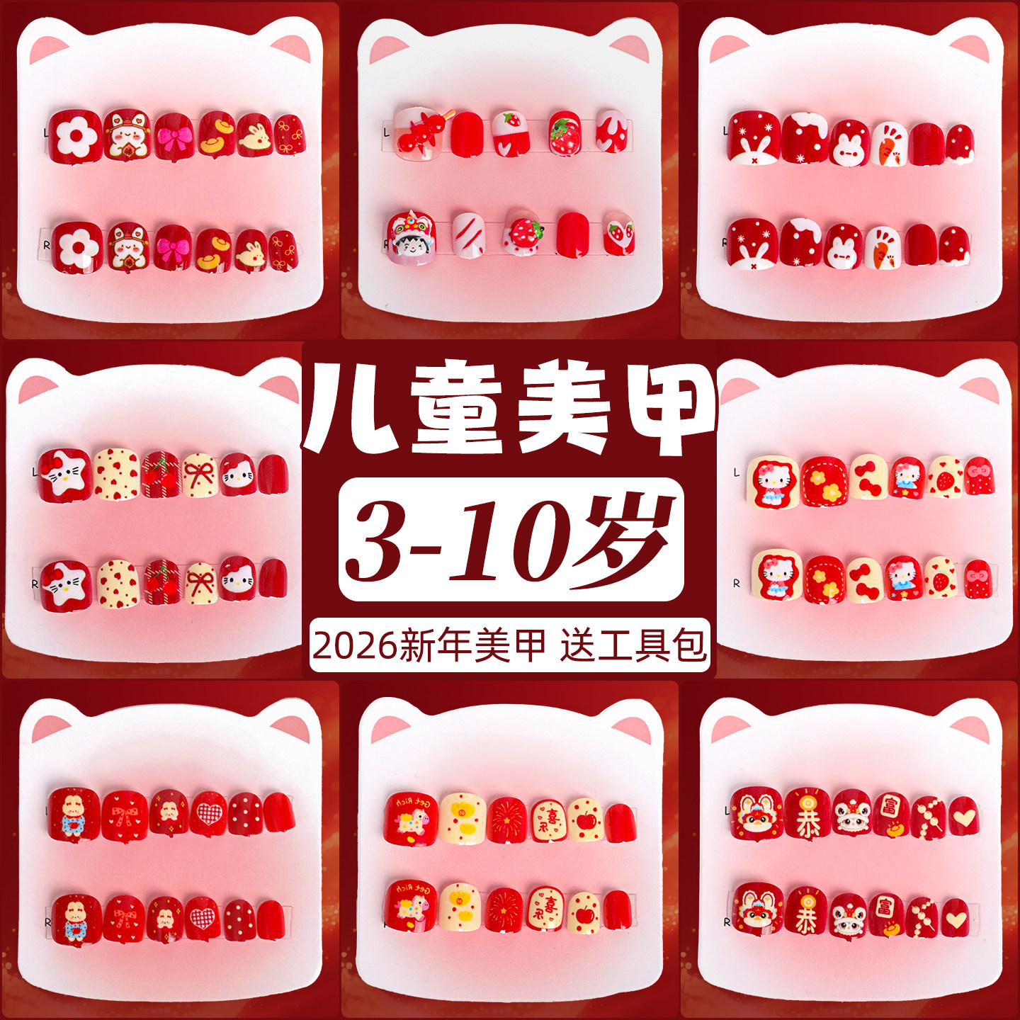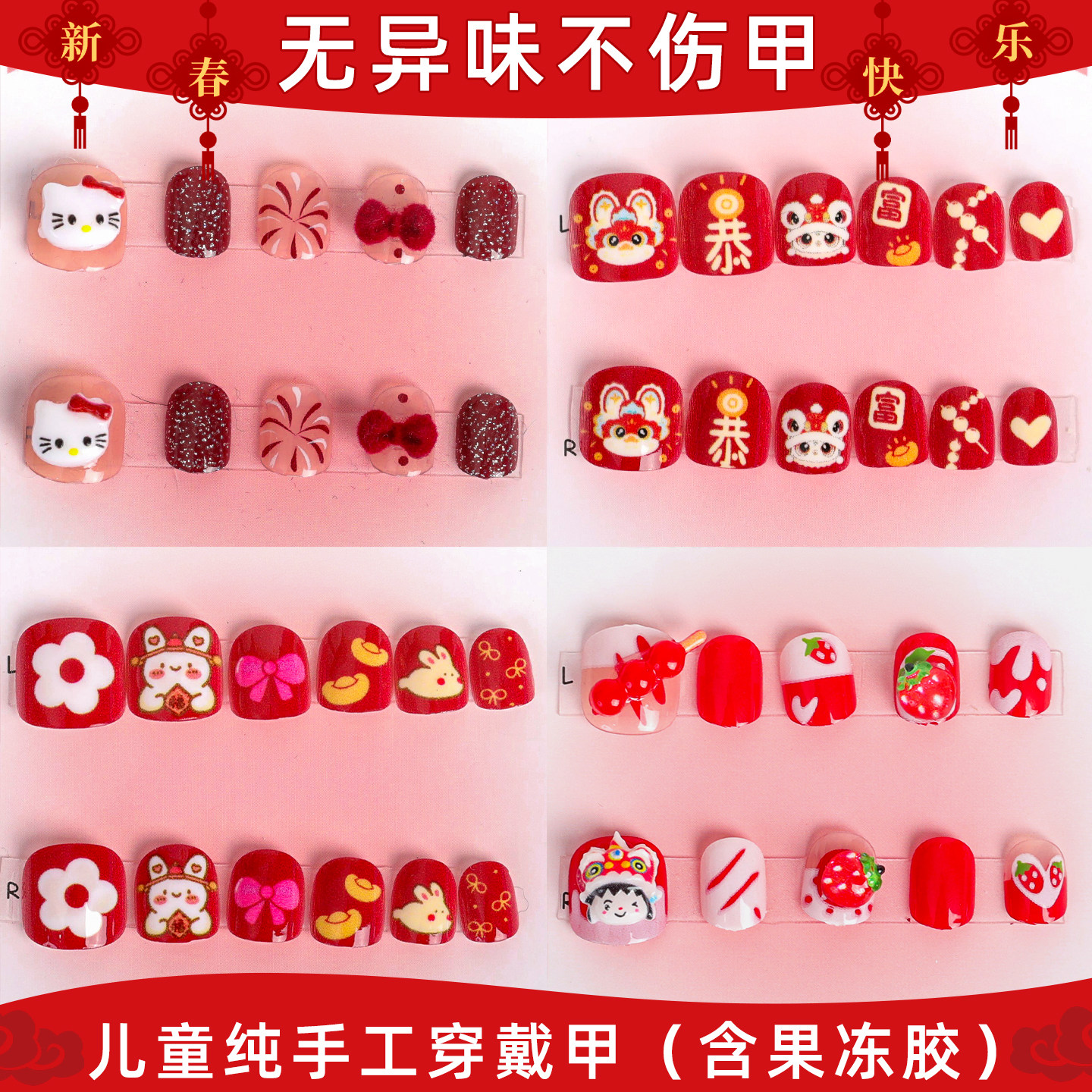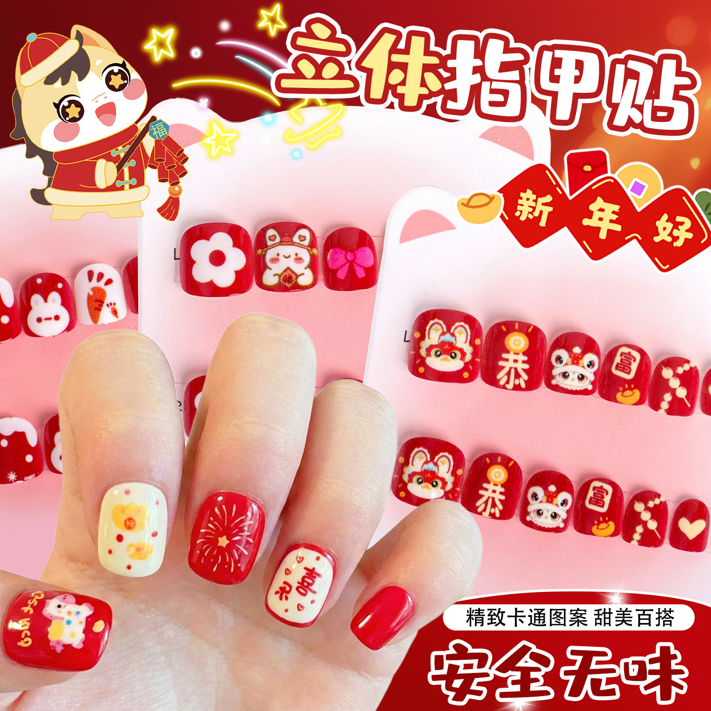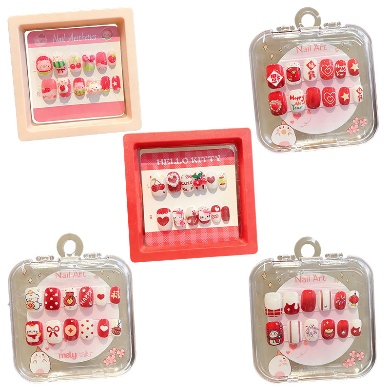 红色新年儿童指甲贴2026新款卡通趣味3-10岁可爱小女孩短款美甲贴显白防水贴纸女童穿戴甲可拆卸软甲贴片贴画