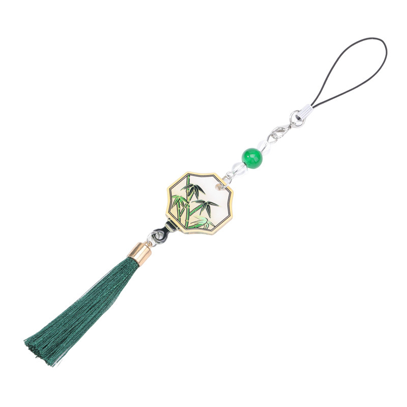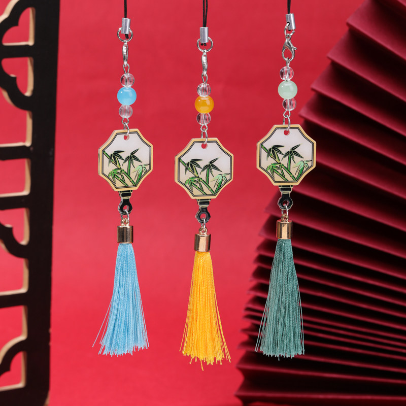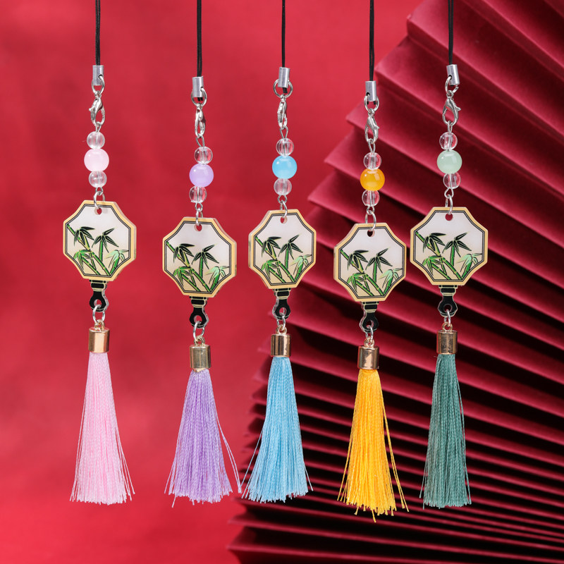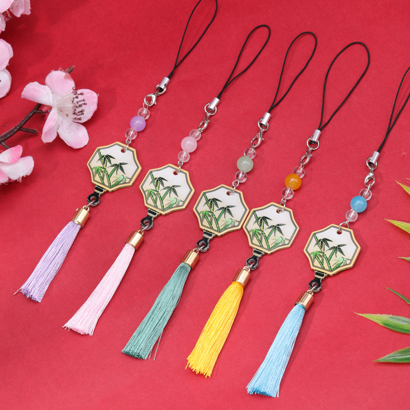 龙虾扣竹叶团扇手机链包包链 diy中国风流苏手机绳配饰包包小挂件