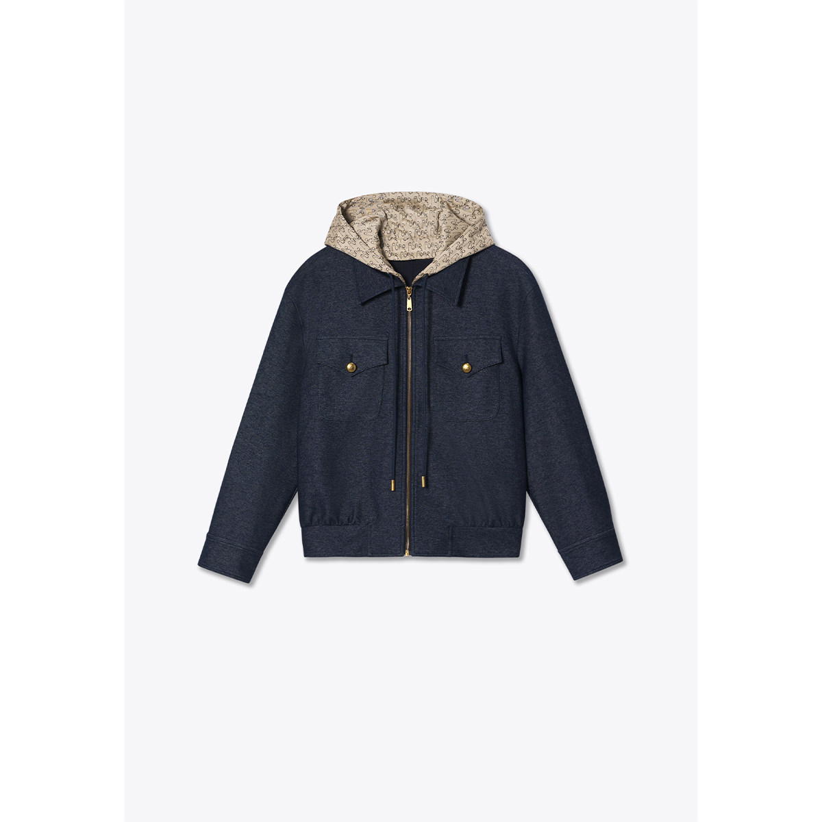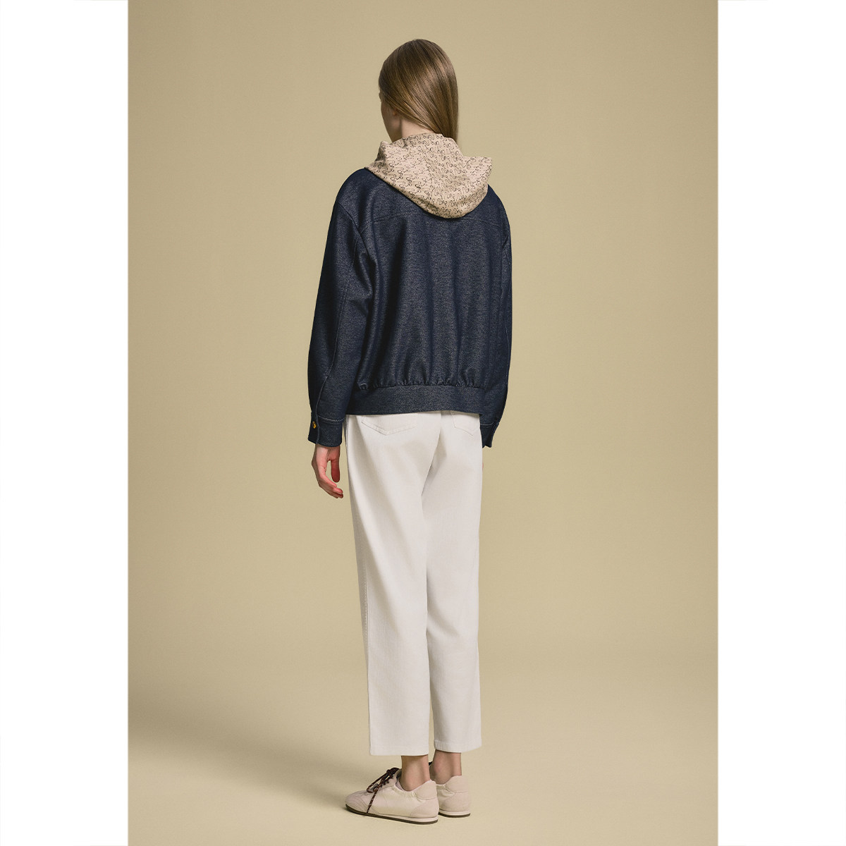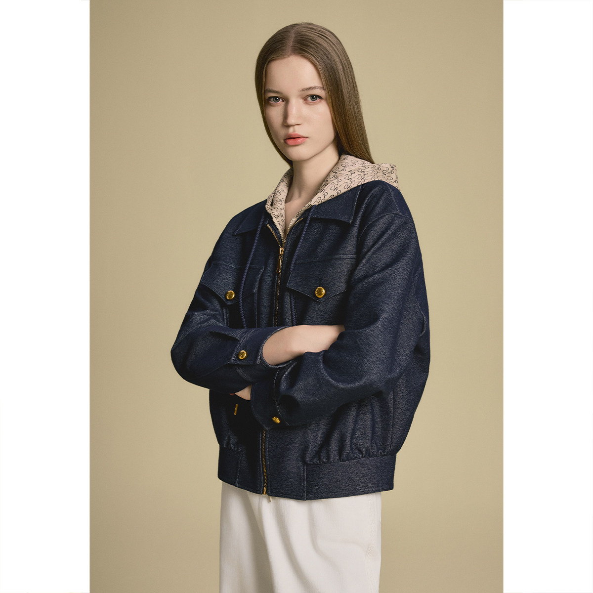 诗篇专选假两件撞色连帽拉链牛仔短外套2025秋款